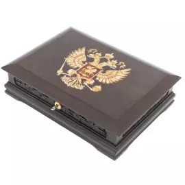 Box made of stained oak and amber "Russia" Box made of stained oak and amber "Russia" The box made of stained oak and amber "Russia" is an elegant and functional accessory that is suitable for storing valuable items. It is made of high-quality material, which guarantees its durability and durability. The coat of arms of the Russian Federation, lined with amber on the lid, gives the box a special charm and style. There is also a convenient lock to protect the contents from theft or damage. This jewelry box will be a wonderful gift for anyone who appreciates quality and beauty. It is suitable for both a manager, a civil servant or an official, and for a foreigner who wants to emphasize his personality and style.