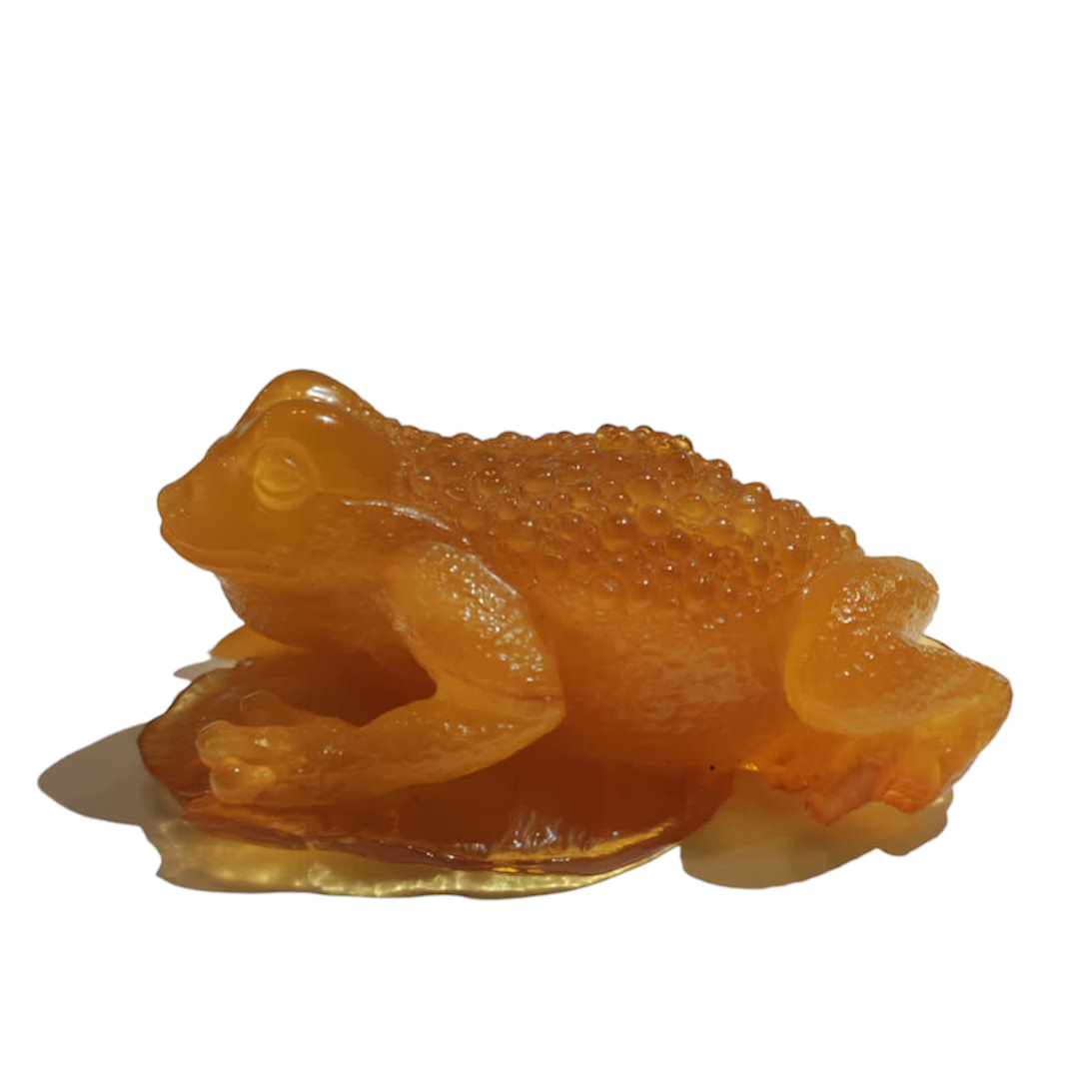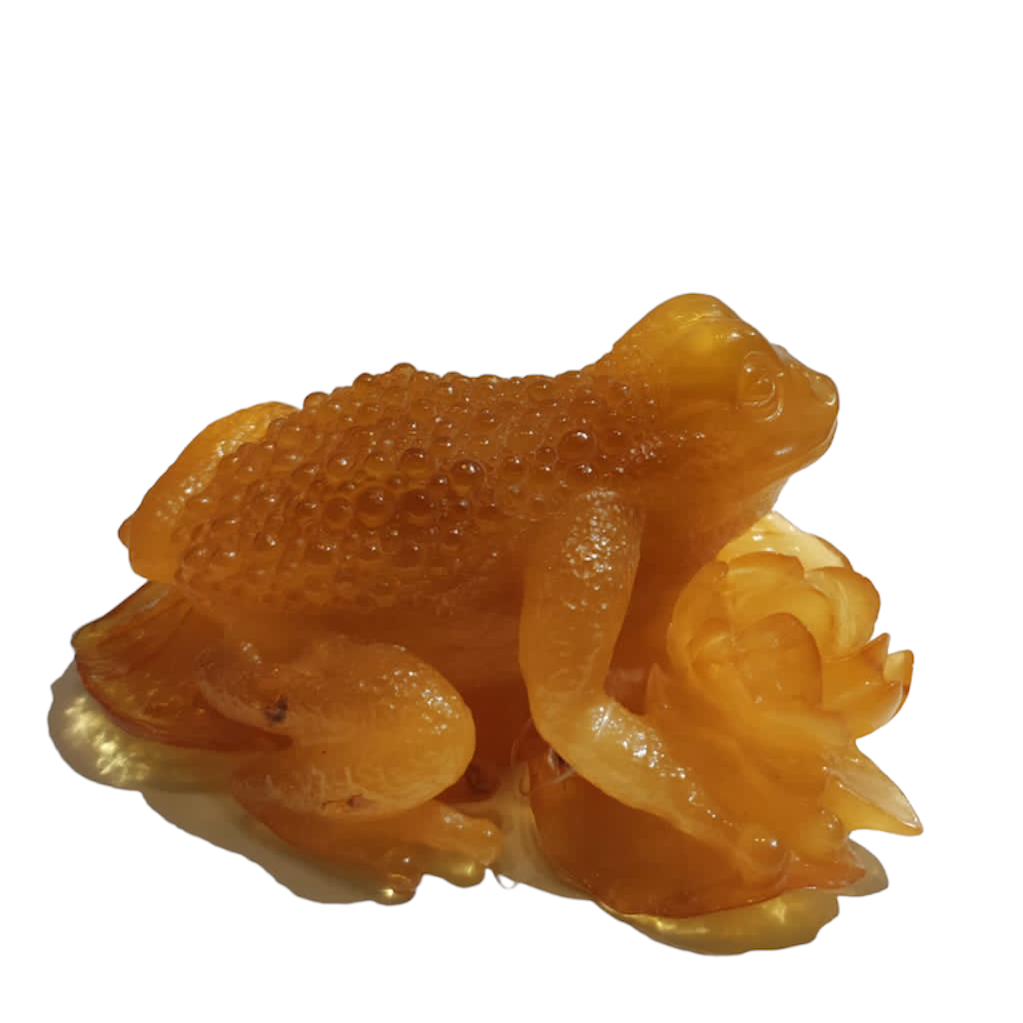 The frog carving is a symbol of wealth, prosperity and success. Handmade from a single piece of milky natural amber.