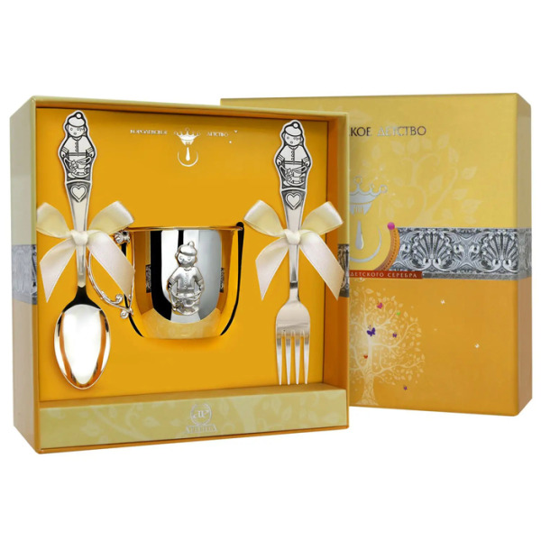 ArgentaSet of silver children's CD "Boy": fork, mug, spoon with gildingSet of silver children's CD "Boy": fork, mug, spoon with gildingThe ROYAL CHILDHOOD collection is one of the widest and most famous collections of children's silver in Russia. It contains many charming models of silver spoons, forks and knives, rattles and pacifiers, drinking cups and mugs. All children's silverware are subject to strict quality control. Ecological silver produced directly at the factory, careful hand polishing with cotton rollers makes the products absolutely safe for the child. Due to the disinfecting function of silver, regular use of silver appliances can support the body's natural immunity and even prevent some of the typical childhood illnesses. The factory's specialists received a grant for the use of a complex but very beautiful guilloche technique, which was used by the famous Carl Faberge. This made it possible to create amazingly bright and three-dimensional images on the products. The collection is full of cute characters who will become loyal friends for the child.