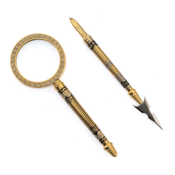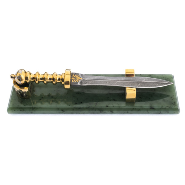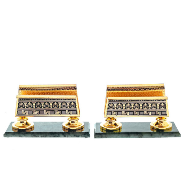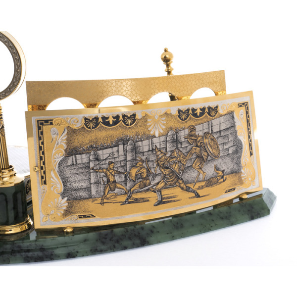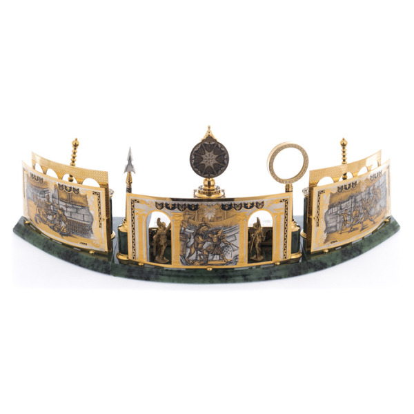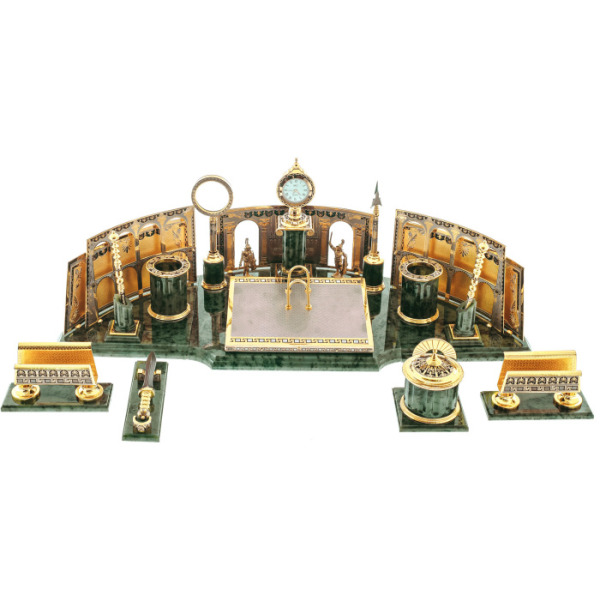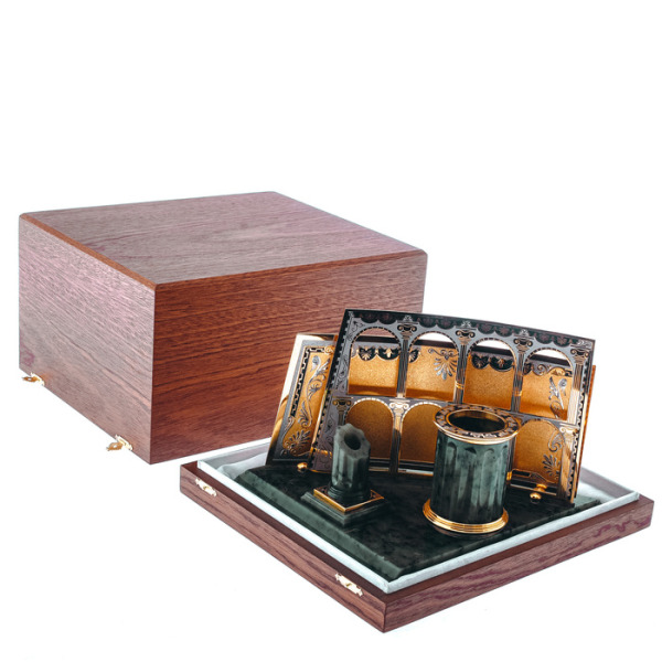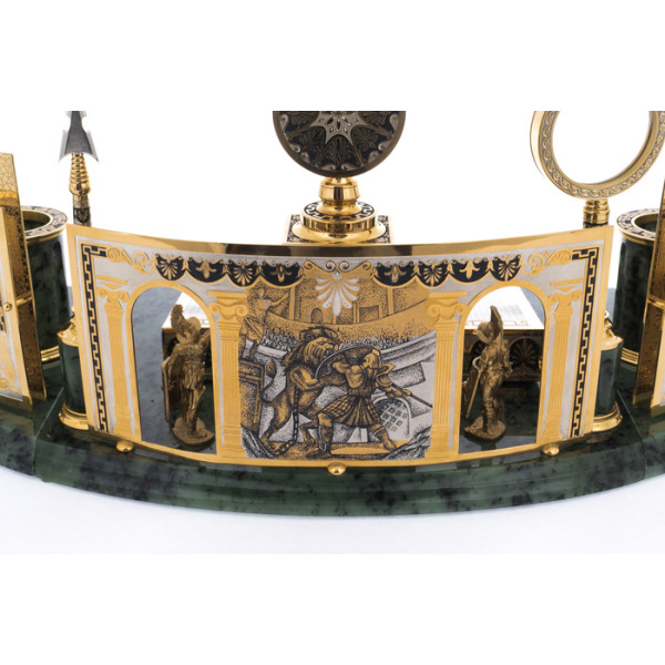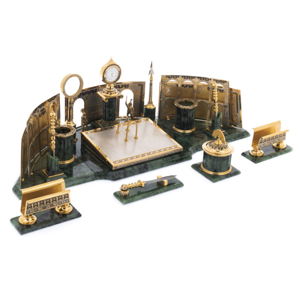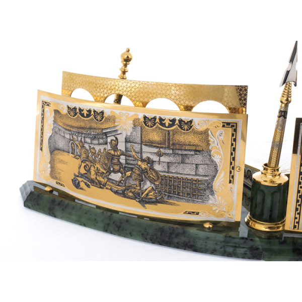 Writing set "Head" on a serpentine stand, ZlatoustWriting set "Head" on a serpentine stand, ZlatoustA symbol of power embodied in gold and stone, this writing set is not just an accessory, but a statement of status. The serpentine, hidden in the bowels of the earth, has long been considered a stone of rulers, possessing the power to protect, inspire and give clarity to thoughts. Its deep, rich hue creates a contrast with the shining gilding that plays on the surface of objects, like the reflections of the sun on the armor of a great commander.