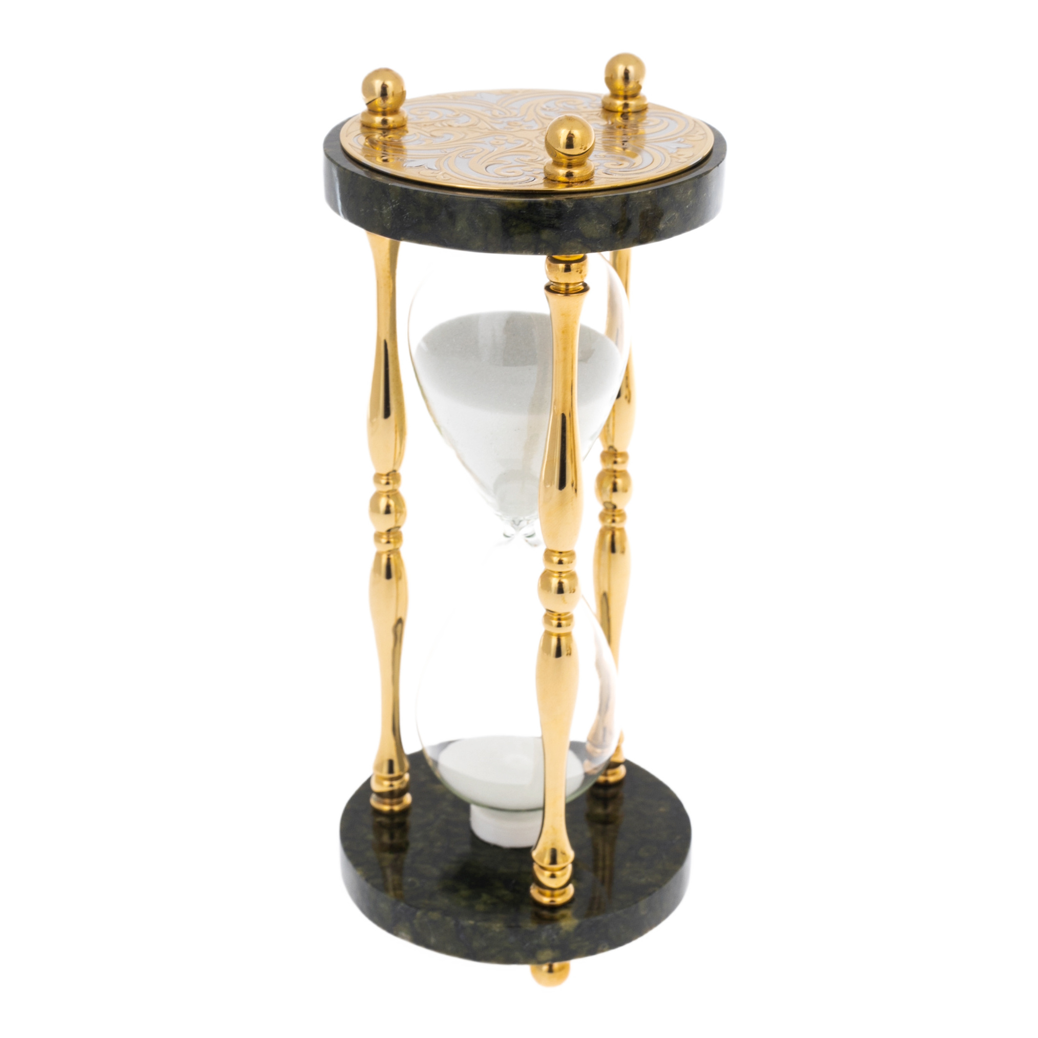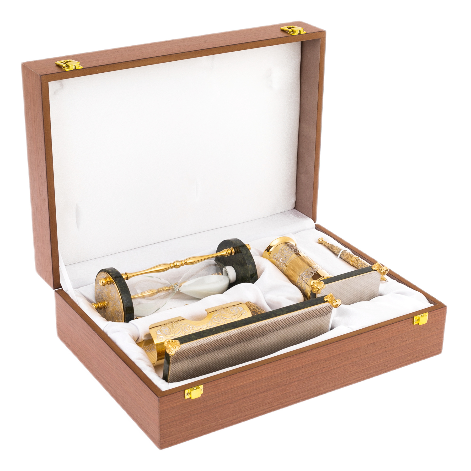 The pen, finely engraved by hand, rests on a massive base, like a blade waiting for a fateful blow. The business card holder is a laconic throne for names inscribed in history, and the hourglass encased in a frame reminds us that power is the art of controlling not only people, but also time. Each element of the set harmoniously combines with the others, creating an ensemble worthy of the office of a man whose word carries weight and whose decisions determine the future.