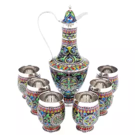 Silver tea set "Soul of the East" for 6 persons, finish Silver tea set "Soul of the East" for 6 persons, finish The Soul of the East tea set is the epitome of exquisite art and age—old traditions, created from 925 sterling silver covered with bright hot enamel. Every line, every curl on the surface of the vessel and glasses creates the feeling of an oriental fairy tale coming to life before the eyes. The rich colors of the enamel, smoothly flowing into each other, like echoes of oriental ornaments, harmoniously combine with the noble luster of silver, giving the product uniqueness and refined charm. The jug, elongated in its shape, is decorated with exquisite patterns reminiscent of the blooming gardens of the East. Its curved handle and flowing nose give the design a grace that perfectly matches the bright, cheerful shades of enamel. The lid of the jug, which crowns the composition, is complemented with refined details, as if reviving the legends of ancient caravans and rich palaces. The glasses included in the set continue this symphony of oriental elegance. Their rounded shape and abundant enamel decoration give each sip of tea an atmosphere of celebration and luxury. Like a mosaic created by the hands of a master, each glass is framed with symbols of prosperity and harmony, which turns an ordinary tea party into a real ritual. The silver used to create the set not only highlights its nobility, but also serves as a sign of superior quality and durability. The hot enamel, applied with jewelry precision, retains its bright hues and luster for many years, making this set not just tableware, but a real work of art. "Soul of the East" is not just a tea set, it is an invitation to the world of luxury, beauty and oriental sophistication. It will be an ideal gift for those who appreciate refined style and strive to surround themselves with objects that can tell their unique story.