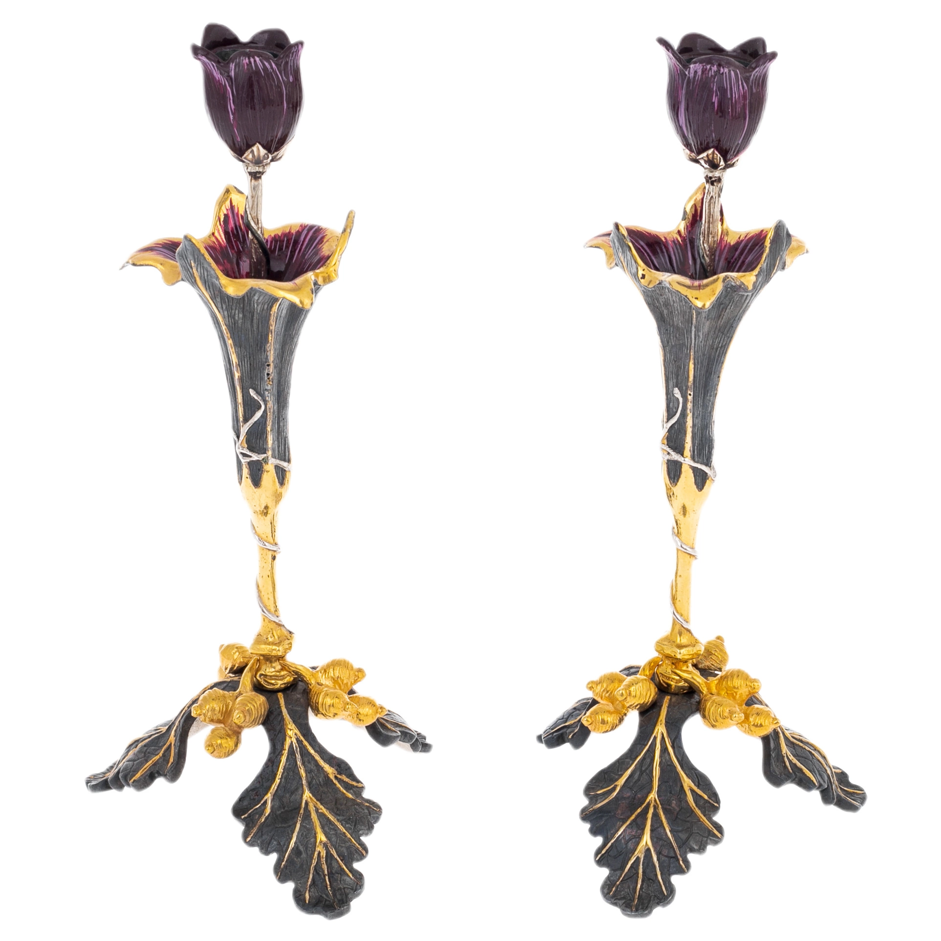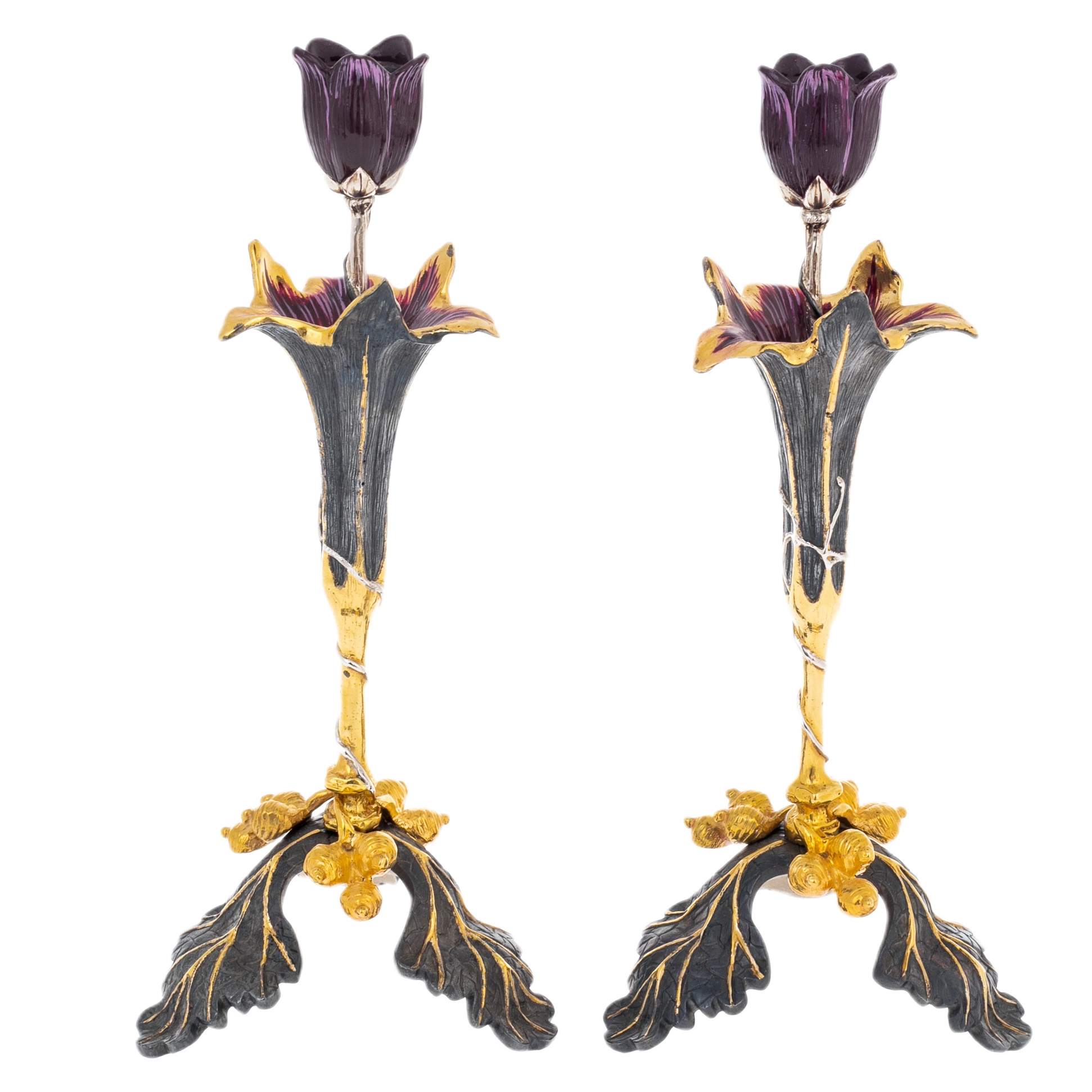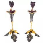 Набор подсвечников «Цветы» из двух предметов, выполненный мастерами Златоуста, представляет собой изящную интерьерную композицию, вдохновлённую природной пластикой. Каждый подсвечник оформлен в виде стилизованного цветка с вытянутой чашей и декоративным бутоном, переходящим в держатель свечи. Контраст тёмной фактуры металла и золочёных акцентов подчёркивает утончённость силуэта и придаёт изделиям выразительную глубину.
