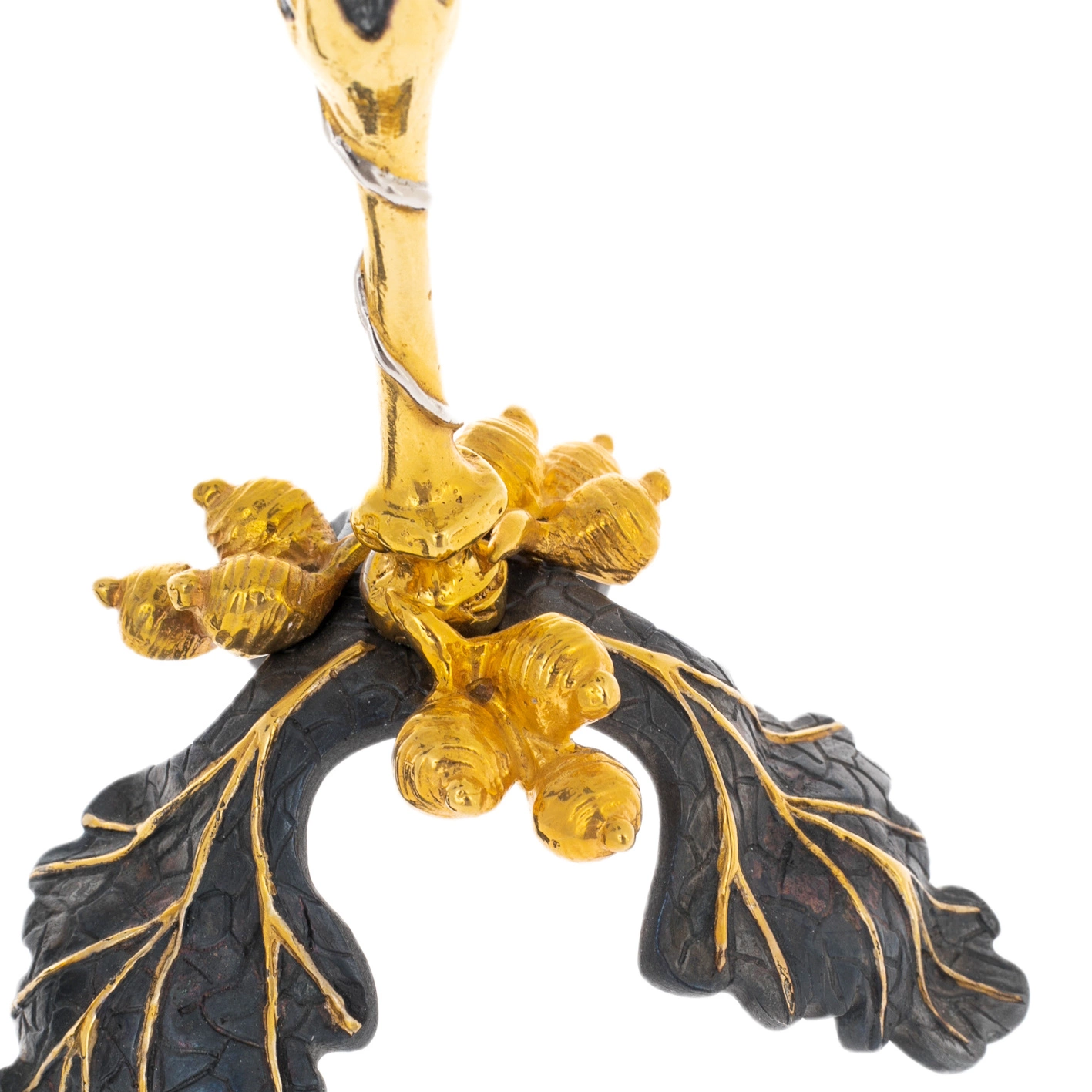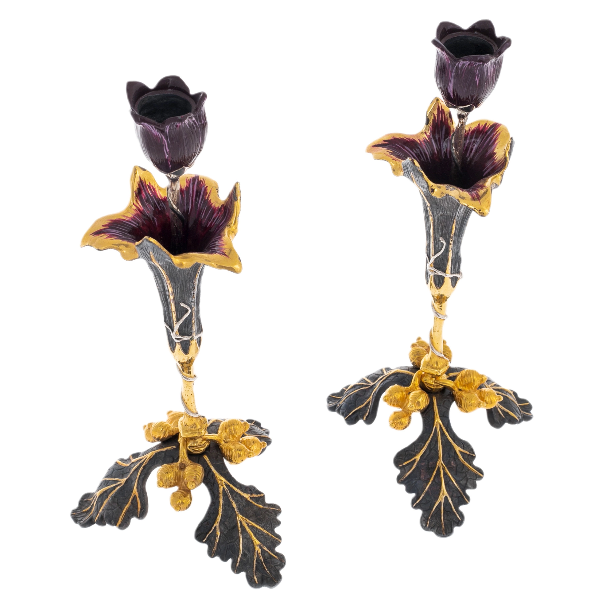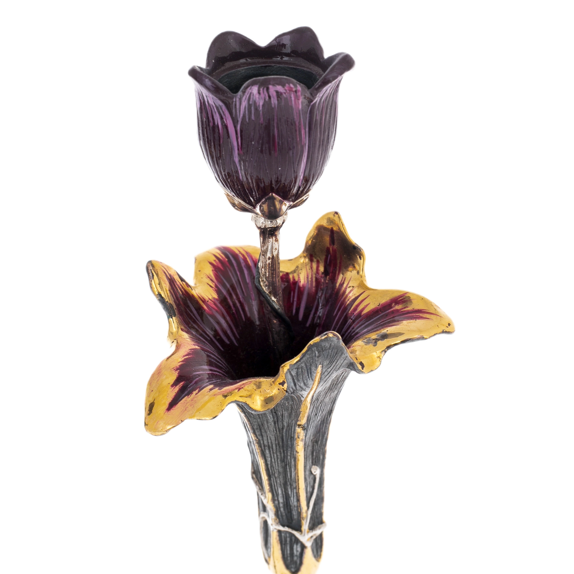 Основание выполнено в форме листьев с рельефной прожилкой, дополнено декоративными элементами, напоминающими ягоды или бутоны. Чаша цветка внутри окрашена в насыщенный оттенок, усиливающий эффект объёма и создающий ощущение живой природной формы. Золочёные края лепестков мягко отражают свет, благодаря чему при зажжённой свече композиция приобретает особую игру бликов и теней. Художественная обработка металла демонстрирует характерные для златоустовской школы приёмы — сочетание матовых и полированных поверхностей, тщательную проработку деталей и гармоничный баланс декоративности.