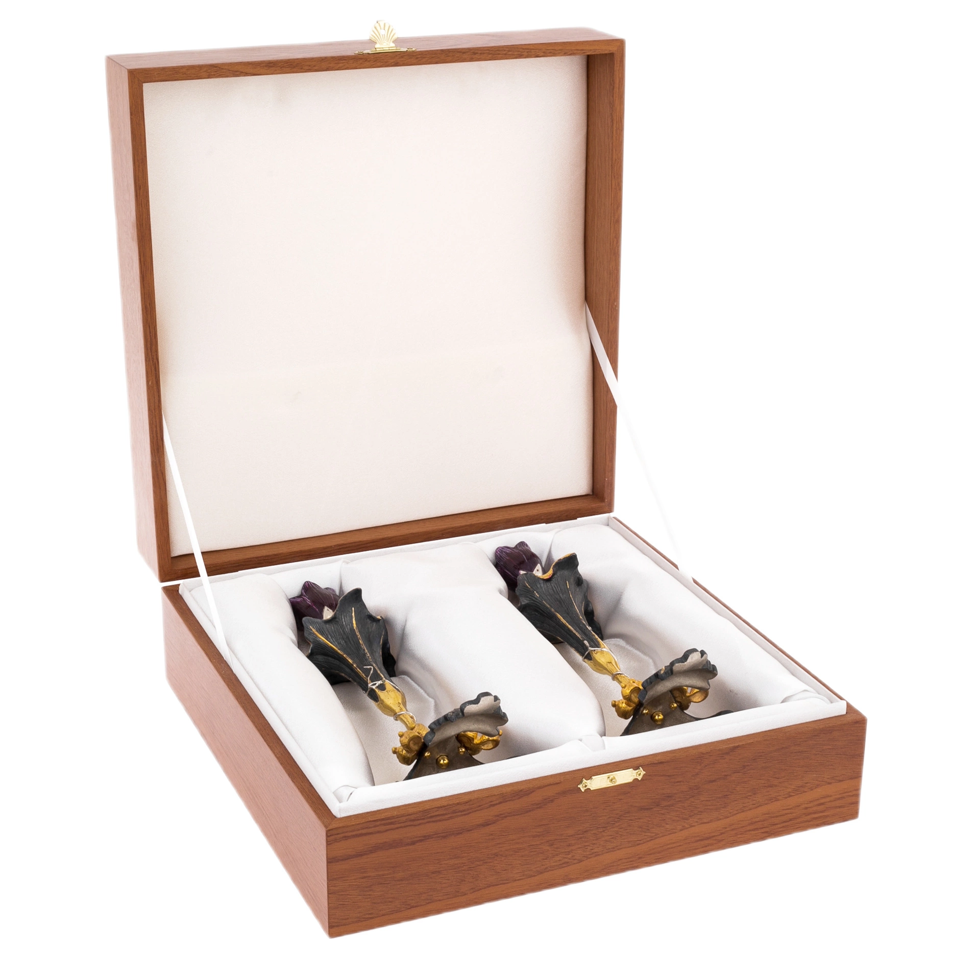 The candlesticks are packed in expensive wooden cases trimmed with red velvet, which gives them an even more festive look. They are designed for those who like to spend evenings surrounded by exquisite things, where every detail matters. This set will be a great gift for a special occasion or will take its place in a collection of luxury items, demonstrating the taste and sense of style of its owner. Such candlesticks are suitable for both special events and intimate evenings, where every detail is important, from the choice of accessories to the interior itself.