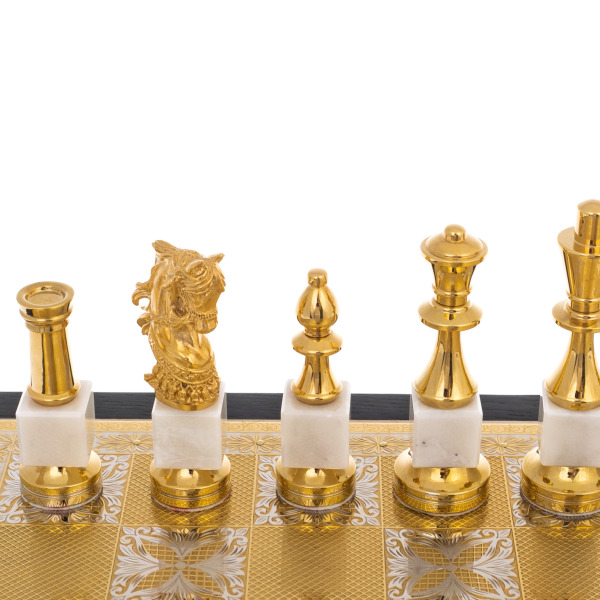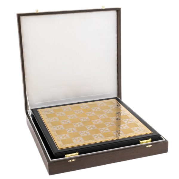 The masters of Chrysostom used the traditional technique of artistic etching on metal, perfected back in the 19th century. This is the most delicate work, requiring a delicate mastery of the instrument and an impeccable sense of composition. The ornament covers every element of the chessboard and the pieces: foliage, vines and symmetrical volutes frame the golden field, as if creating a fresco on metal. Hand-engraved, applied with a needle and then rolled by hand, gives the chess a spectacular relief and depth, and gilding completes the image of an authentic work of decorative and applied art.