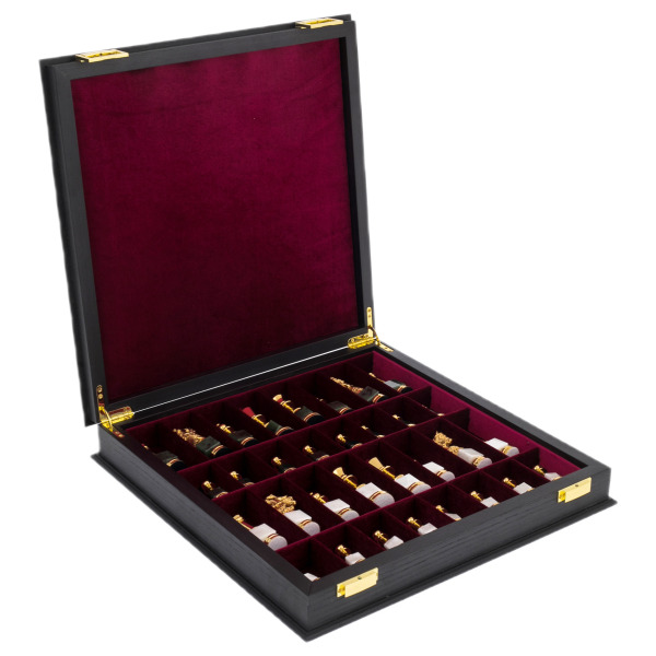 The casket is made in the form of a casket without a handle on stable legs. The parts of the board are held together by wear-resistant copper fittings. Inside it there is an inserted soft tray with recesses for each figure. This provides protection for them even during shaking and transportation. There is a chess playing field on the top lid of the casket, so it can also be used directly for the game itself.