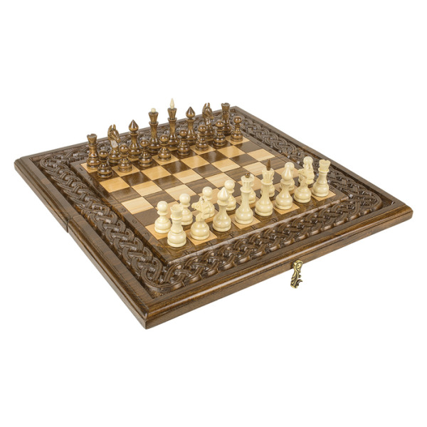 Chess + backgammon carved "Armenian Ornament 2" 40, HaleyanChess + backgammon carved "Armenian Ornament 2" 40, HaleyanThe strength and reliability of the game board are provided by natural beech wood. It does not crack over time, so the surface can last for many years without any deformations. It also has an interesting texture, which is intentionally emphasized here with a varnish that gives additional shine. The numbers and letters are applied by burning, so they will remain visible even after a decade. Even with active parties, nothing will happen, and the appearance will remain consistently attractive.