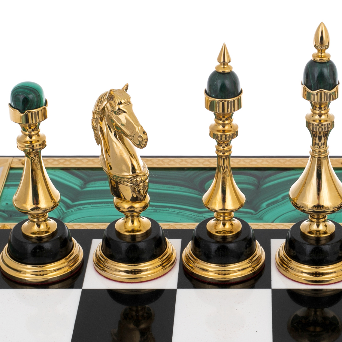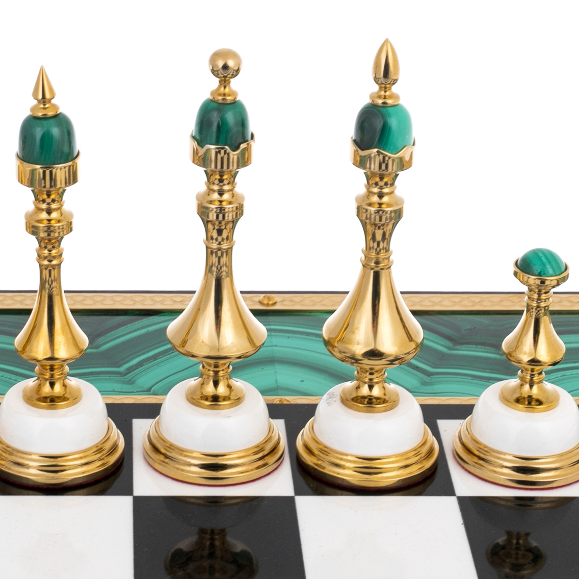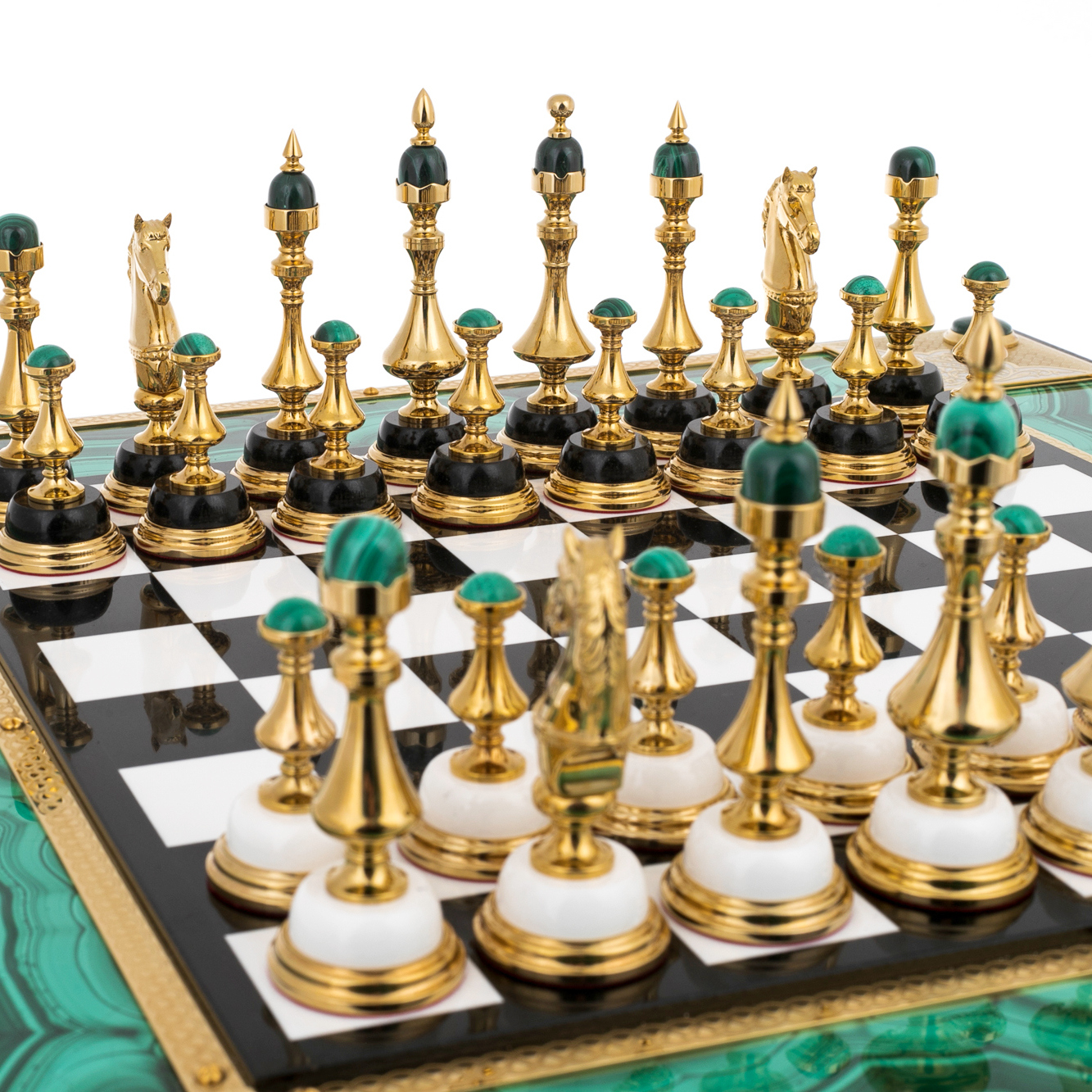 The gold—plated brass figures are decorated with malachite inlays, one of the most exquisite and rare semi-precious stones. This mineral is known for its bright green iridescences, symbolizing nature, strength and prosperity. Malachite details give each figure a special personality, making them not just game elements, but real jewelry masterpieces.