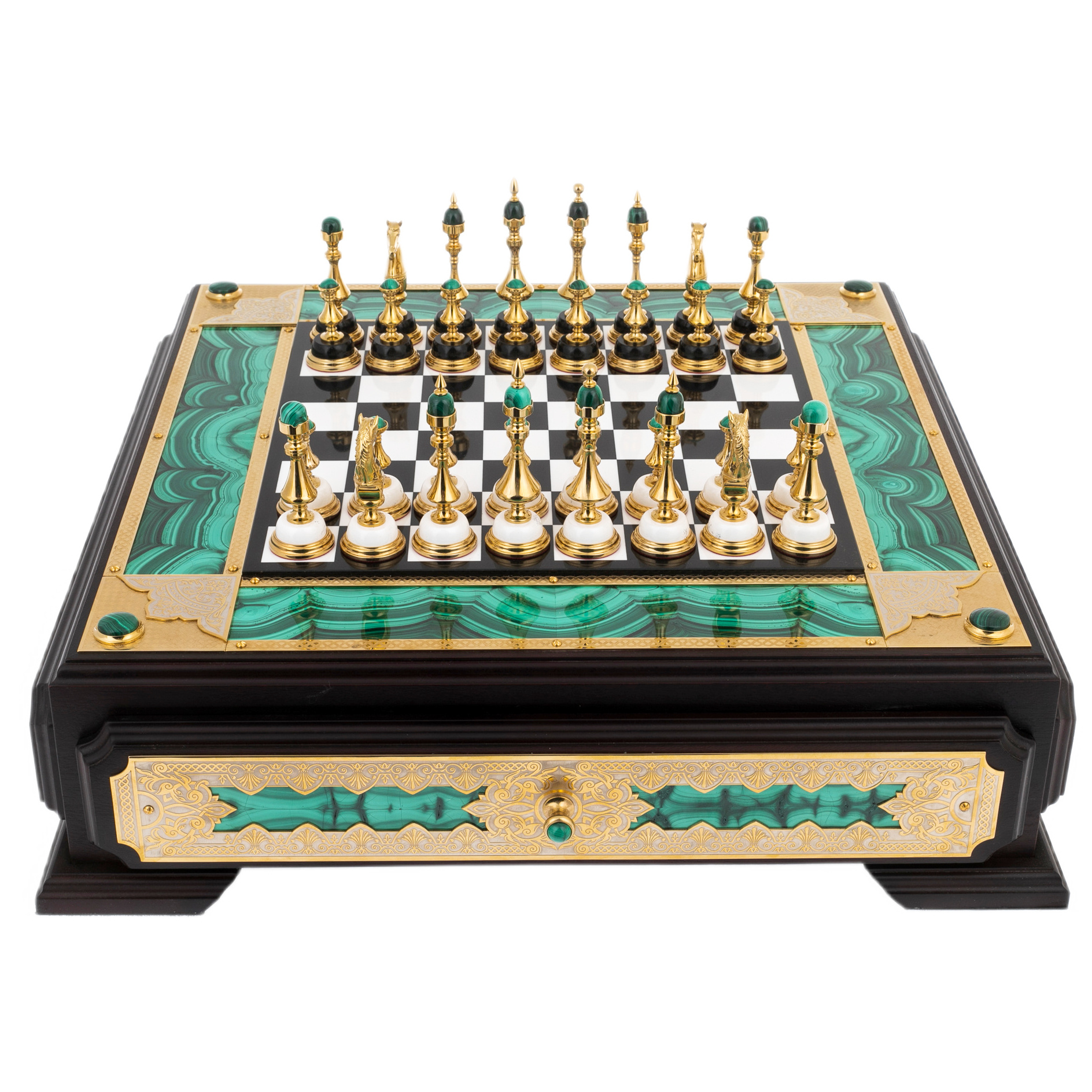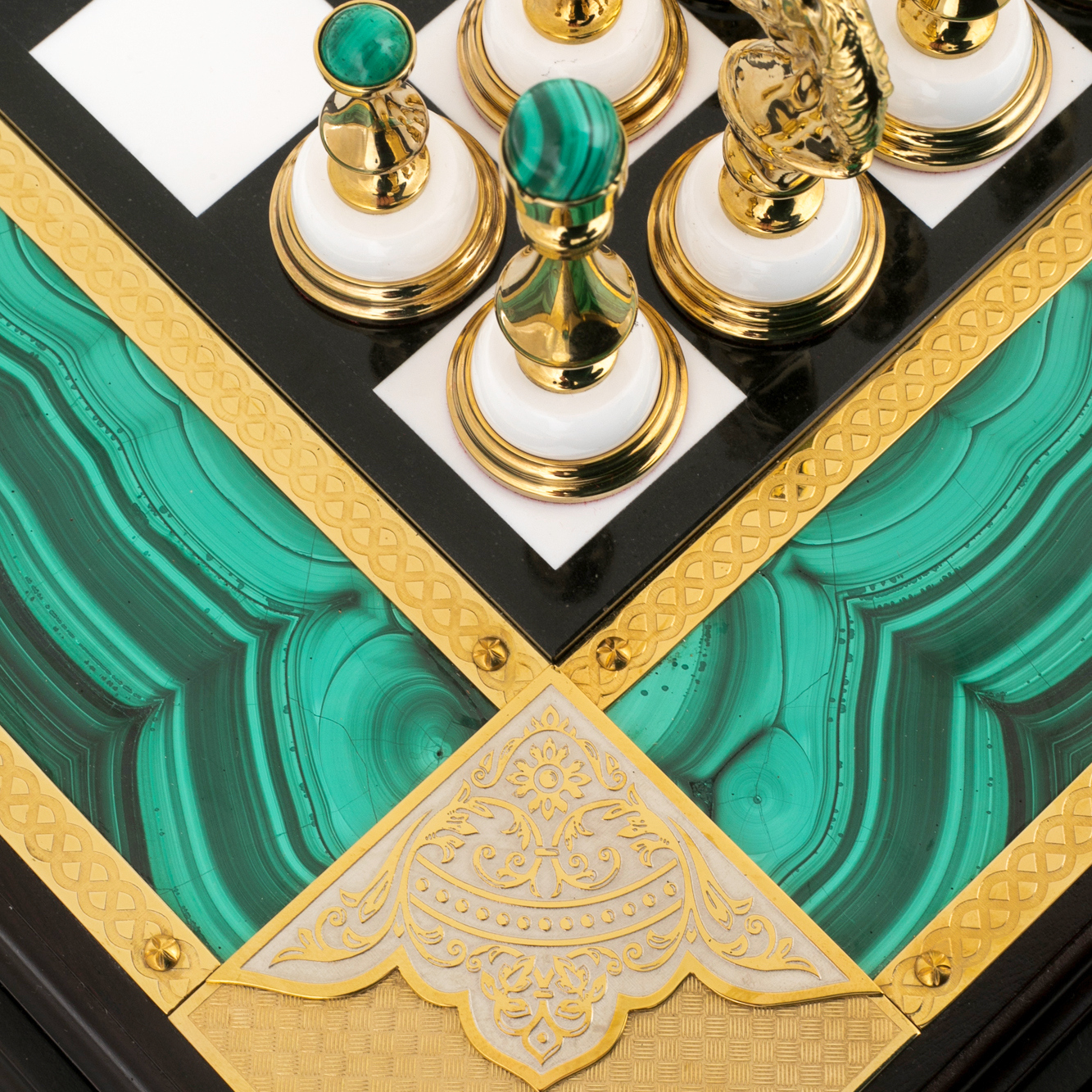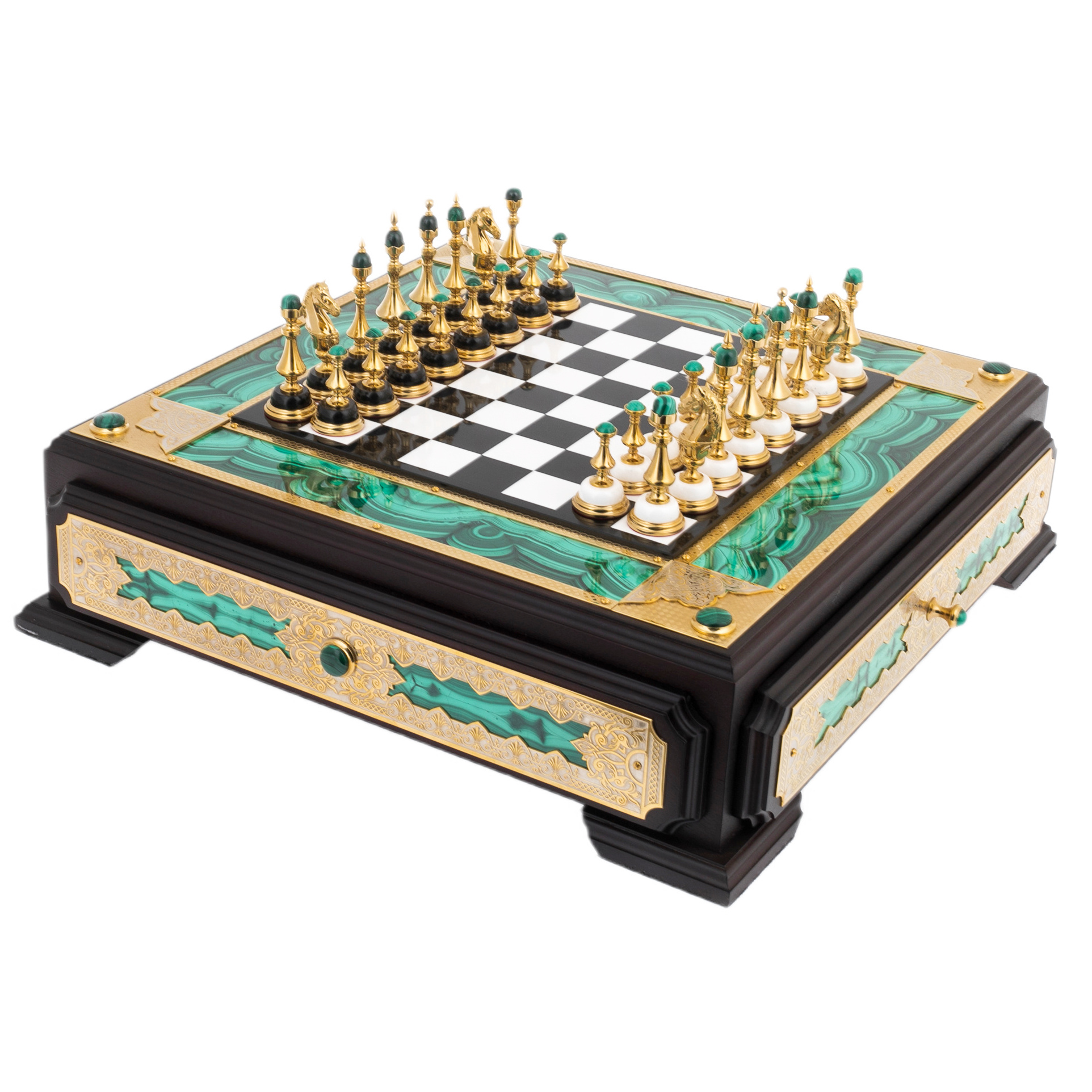 The gold—plated brass figures are decorated with malachite inlays, one of the most exquisite and rare semi-precious stones. This mineral is known for its bright green iridescences, symbolizing nature, strength and prosperity. Malachite details give each figure a special personality, making them not just game elements, but real jewelry masterpieces.