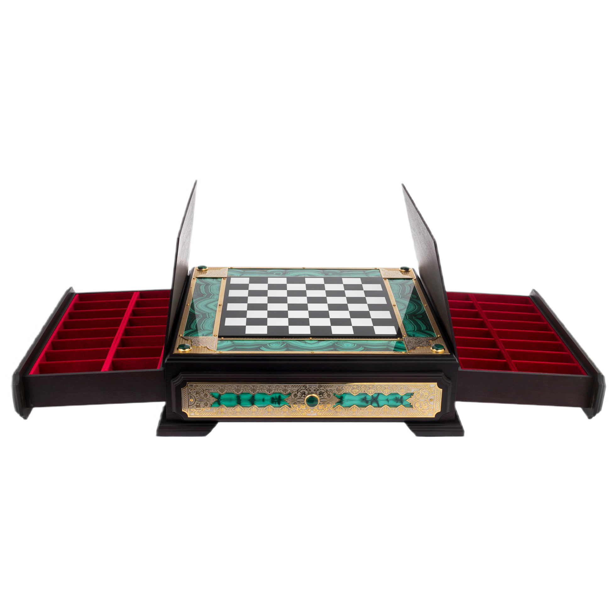 The chessboard, made of marble and framed with patterns of malachite and gold, creates a sense of harmony and grace. Each cage is a combination of classic black and white aesthetics with the natural beauty of the materials. The splendor of marble and the richness of malachite make playing on such a board a truly royal pleasure.