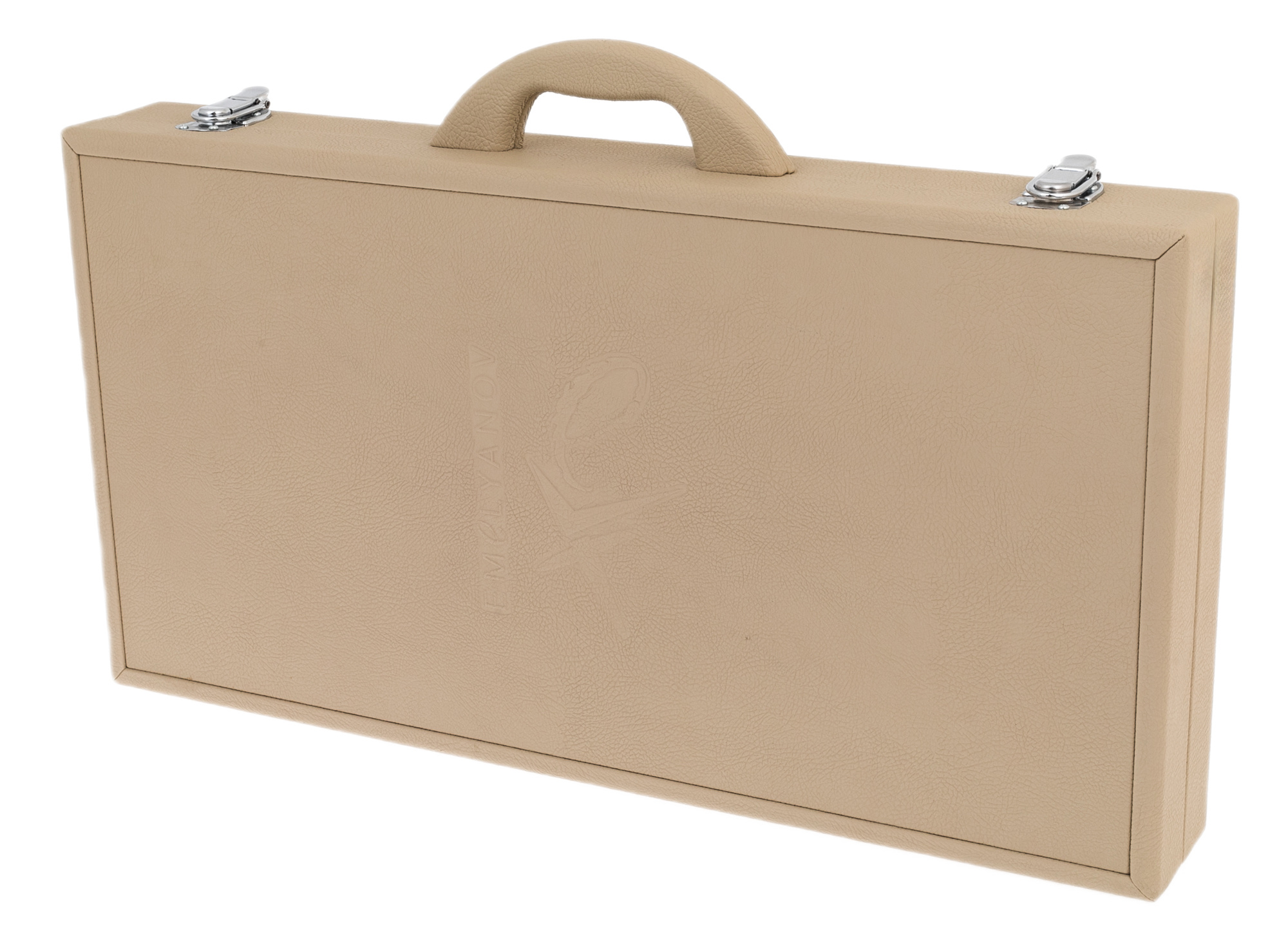 Фигуры из композитного камня имитируют слоновую кость и чёрный янтарь, подчёркивая благородство каждой партии. Белые — тёплого кремового оттенка с матовой глубиной, чёрные — насыщенного бордово-чёрного тона с отливом, похожим на карельскую берёзу, — словно перенесены из художественного музея. Каждая фигура — миниатюрная скульптура, доведённая до совершенства в деталях. Внимание привлекают резные кони, напоминающие древневосточные мотивы, и утончённые силуэты ферзей, грациозно вытянутых вверх. Увесистые, сбалансированные по весу фигуры ложатся в руку как тёплый камень, усиливая телесное удовольствие от каждой расстановки.