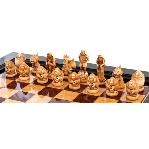 Chess from the mammoth tusk "Alice in Wonderland"Chess from the mammoth tusk "Alice in Wonderland"A unique chess set based on the fairy tale of the same name. The figures here are the characters of this beautiful story. But the surprises of the master do not end there: the board is a separate achievement of design thought. Neon LEDs are mounted in the walnut body, illuminating the mirrored chess squares with a bluish light. It is both a light well leading to a Wonderland and a magic mirror behind which the chess kingdom lives.