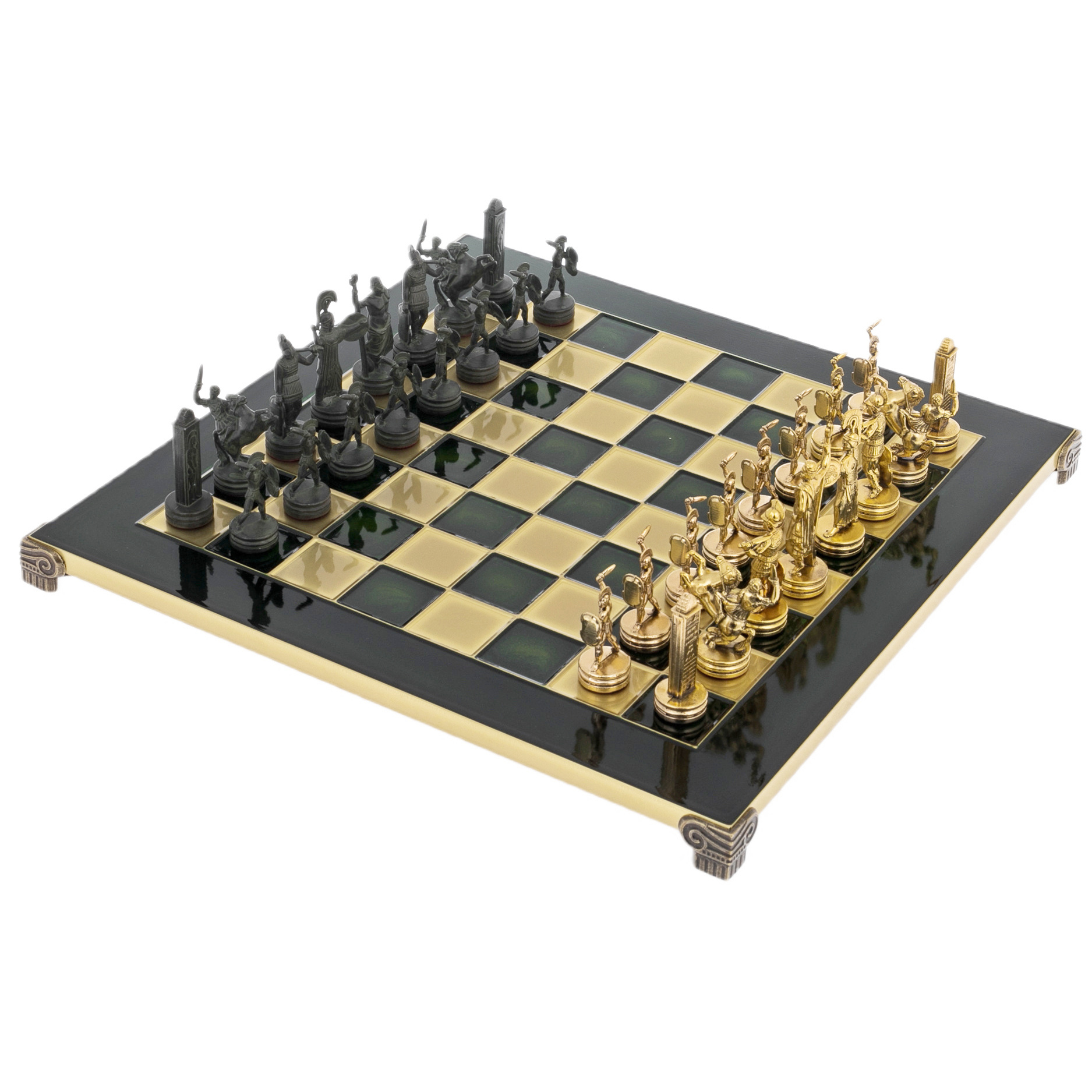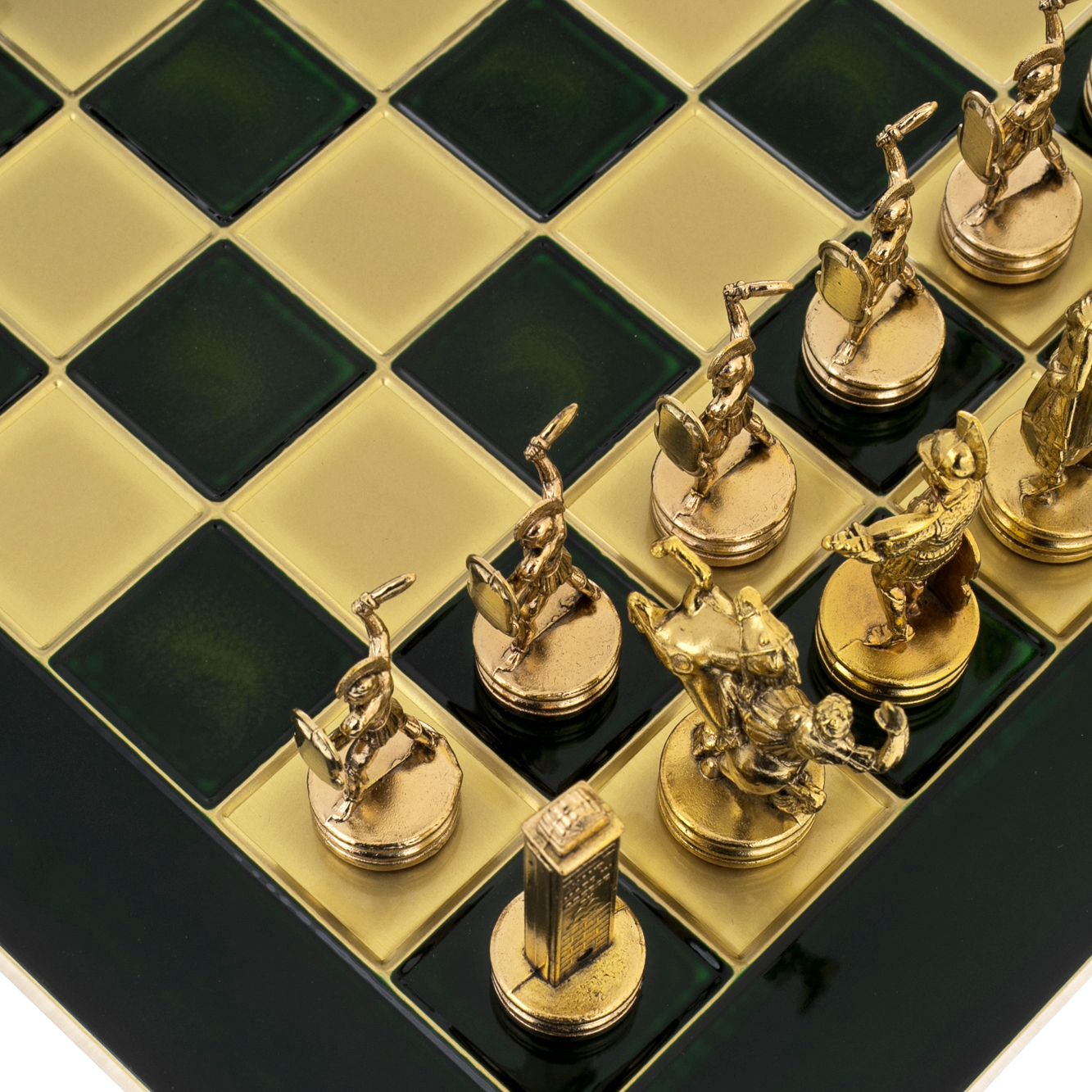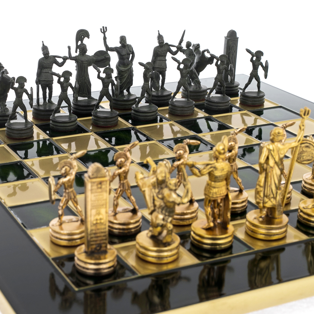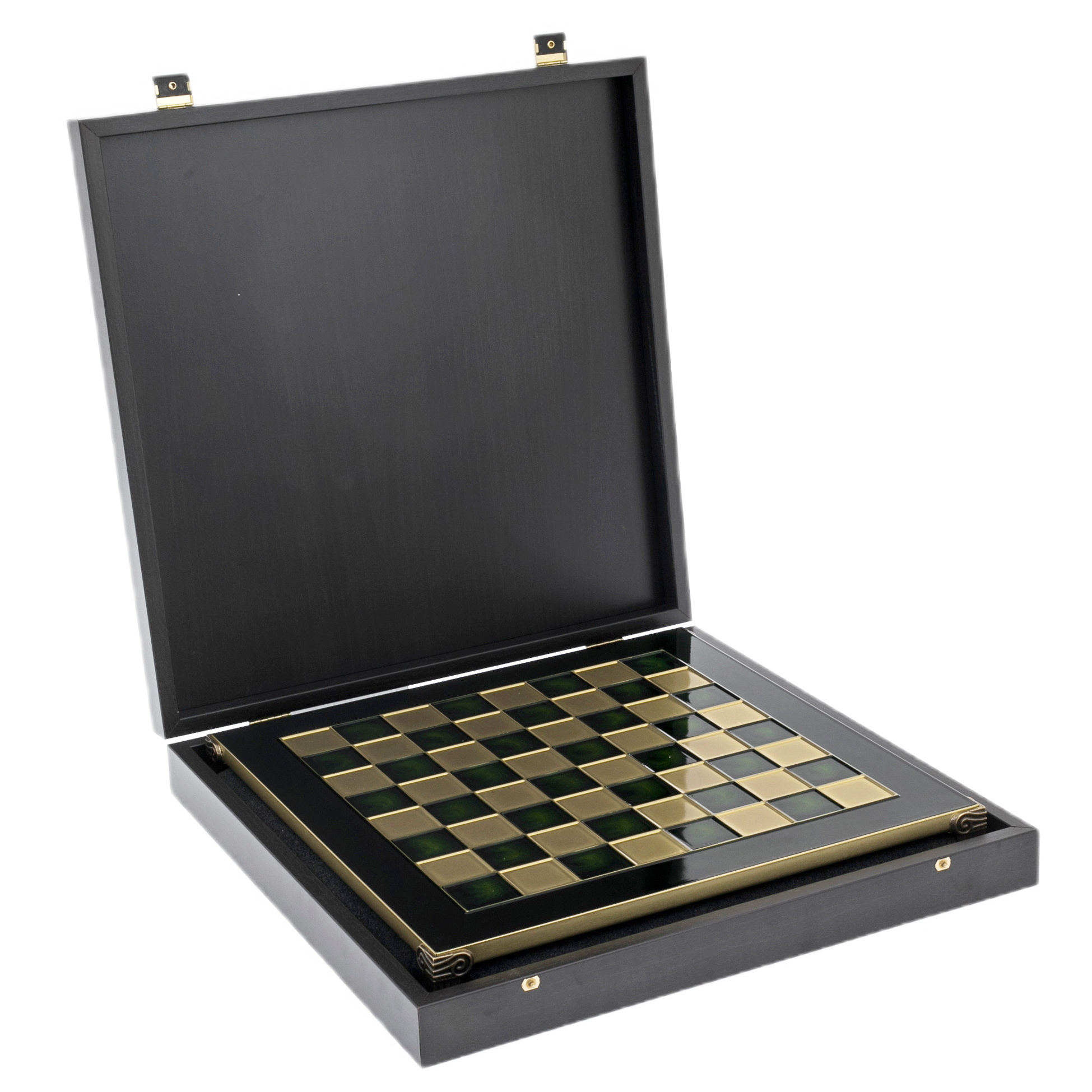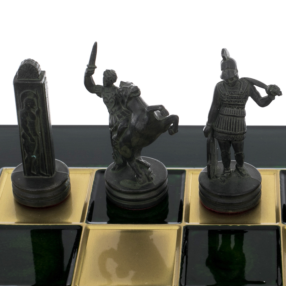 Материал фигур и доски подчинён идее величия. Гладкая поверхность клеток, отливающая глубокой зеленью, обрамлена золотистой рамкой с классическими угловыми элементами в форме античных завитков. Контраст глянцевого сияния и массивности фигур создаёт гармонию, напоминающую сочетание мраморных храмов и бронзовых статуй Эллады. Здесь нет случайных деталей: каждая черта несёт отпечаток античной традиции, воссозданной с вниманием и уважением к её первоисточнику.