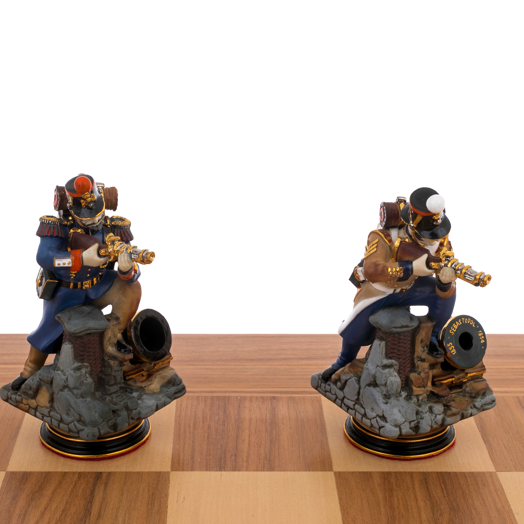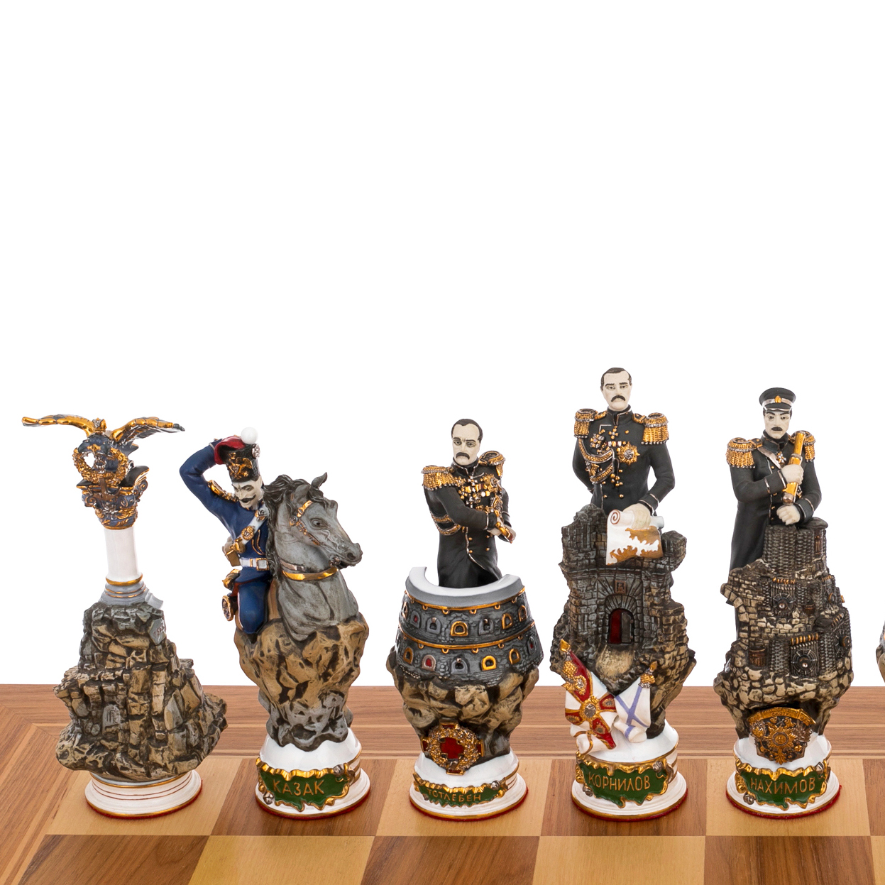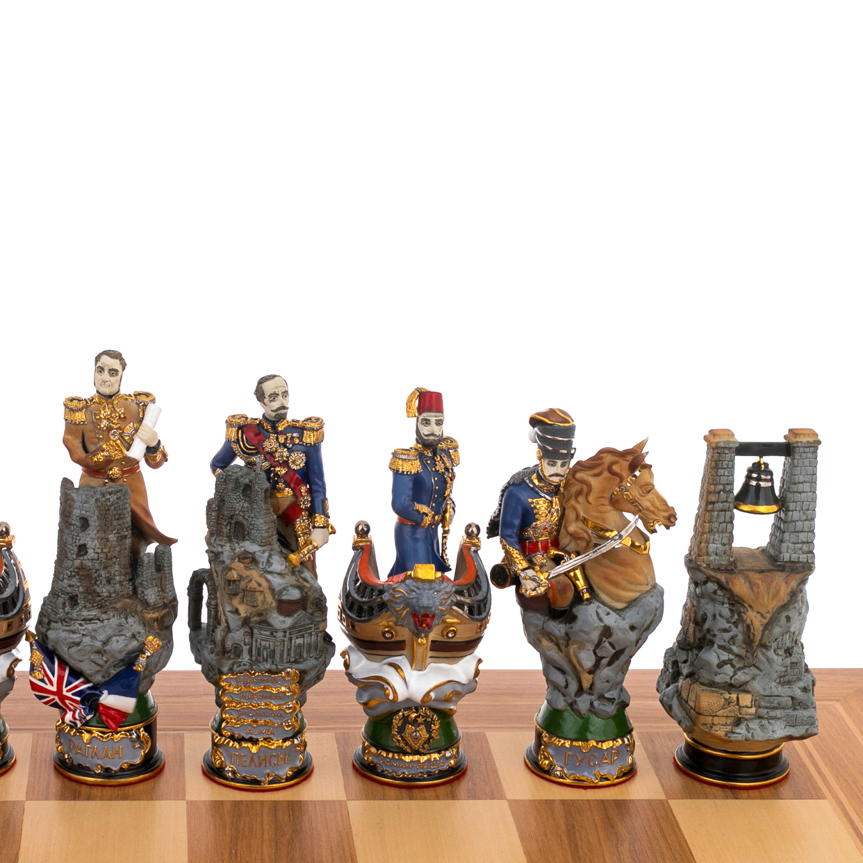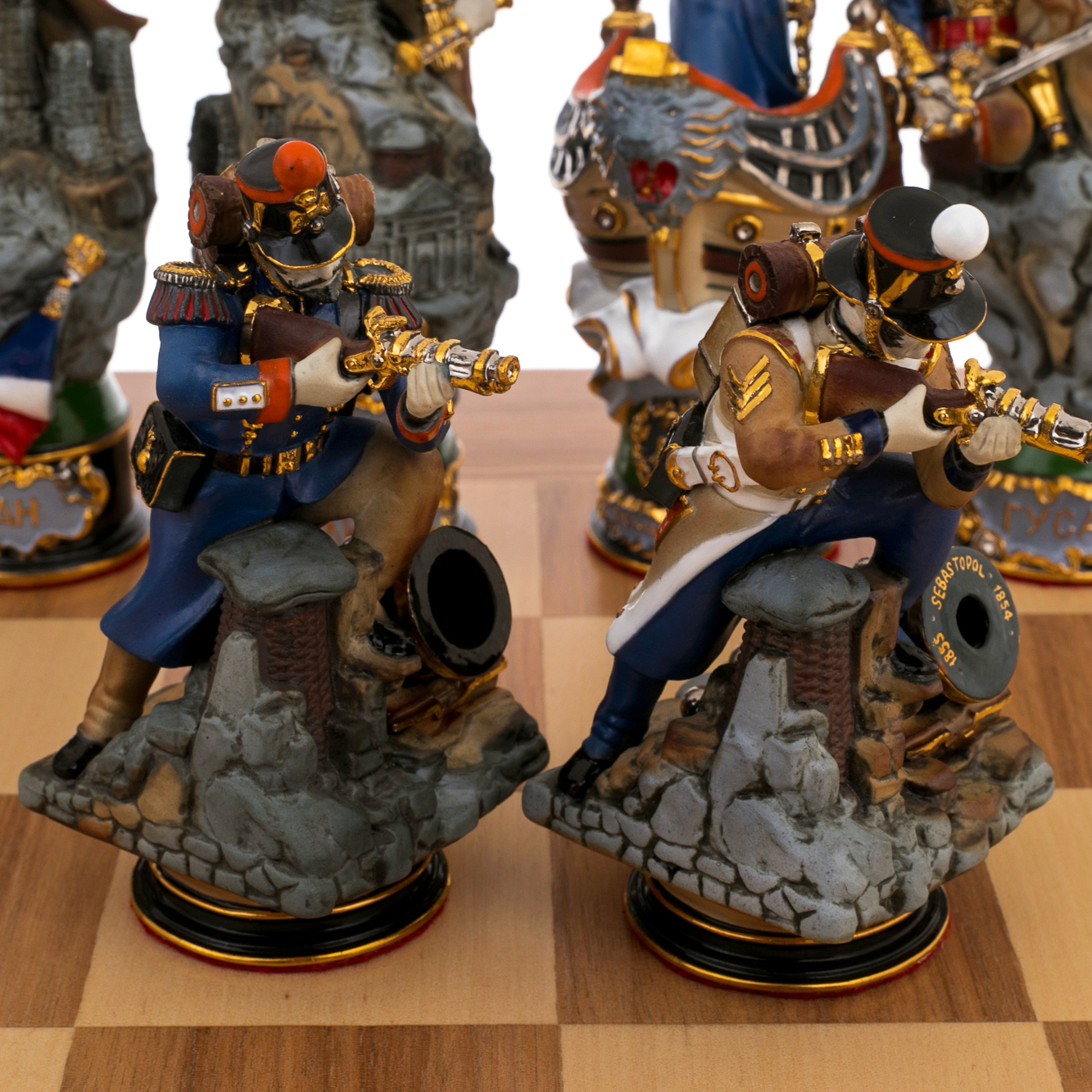 The pieces on the board are not just characters, but historical figures and elements that symbolize the most important aspects of the battle. The Russian side is represented by great officers such as Admirals Kornilov and Nakhimov, whose figures are executed with amazing detail: uniforms with gold aiguillettes, unwavering views of leaders ready to defend their Homeland. Pawns are soldiers dressed in uniforms of the time, holding muskets and surrounded by fortifications. On the other side of the board are the allied forces of England, France and Turkey. Their leaders are also depicted with historical accuracy, and the infantry, guns, and warships convey the spirit of their fleets and armies.