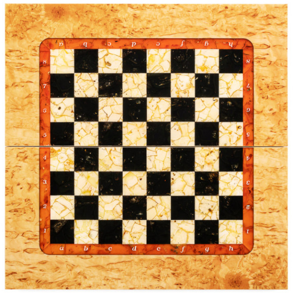Chess made of amber and stained oak "Arabesque-Marine"Chess made of amber and stained oak "Arabesque-Marine"The impeccable quality and exclusive design of elite chess will not leave indifferent a true connoisseur of good-quality and beautiful things! These chess pieces are made by hand from natural amber in the "Kovrov mosaic" technique. The texture of the materials is unique: it is impossible to make two completely identical chess sets. Amber composite of various shades is used for the manufacture of gaming accessories.
