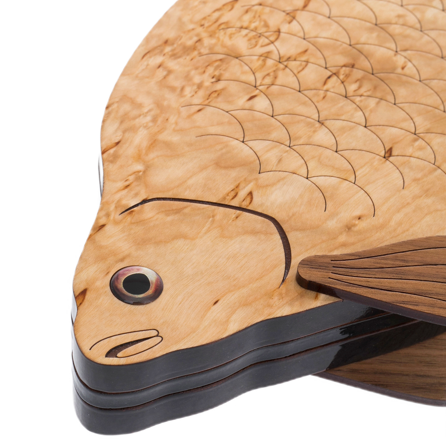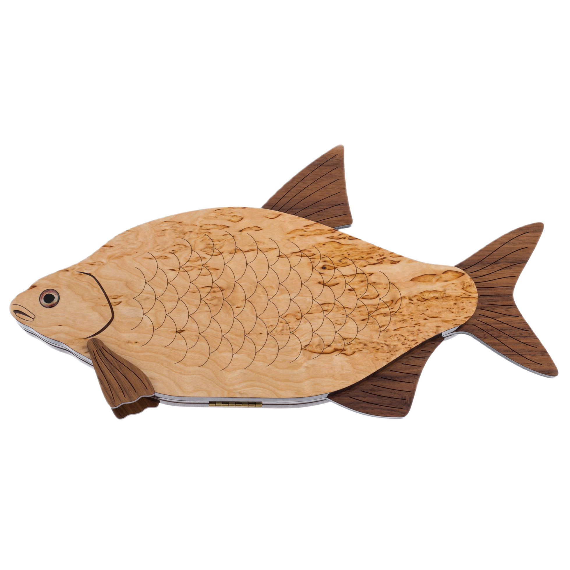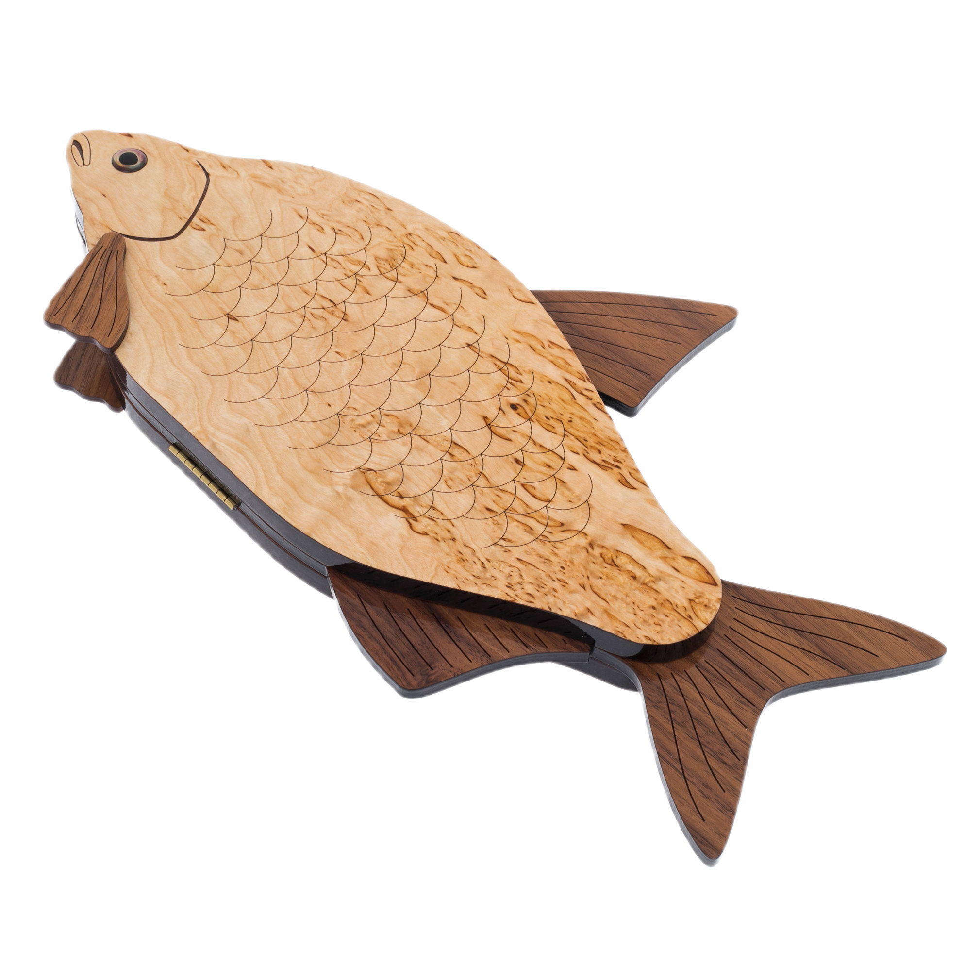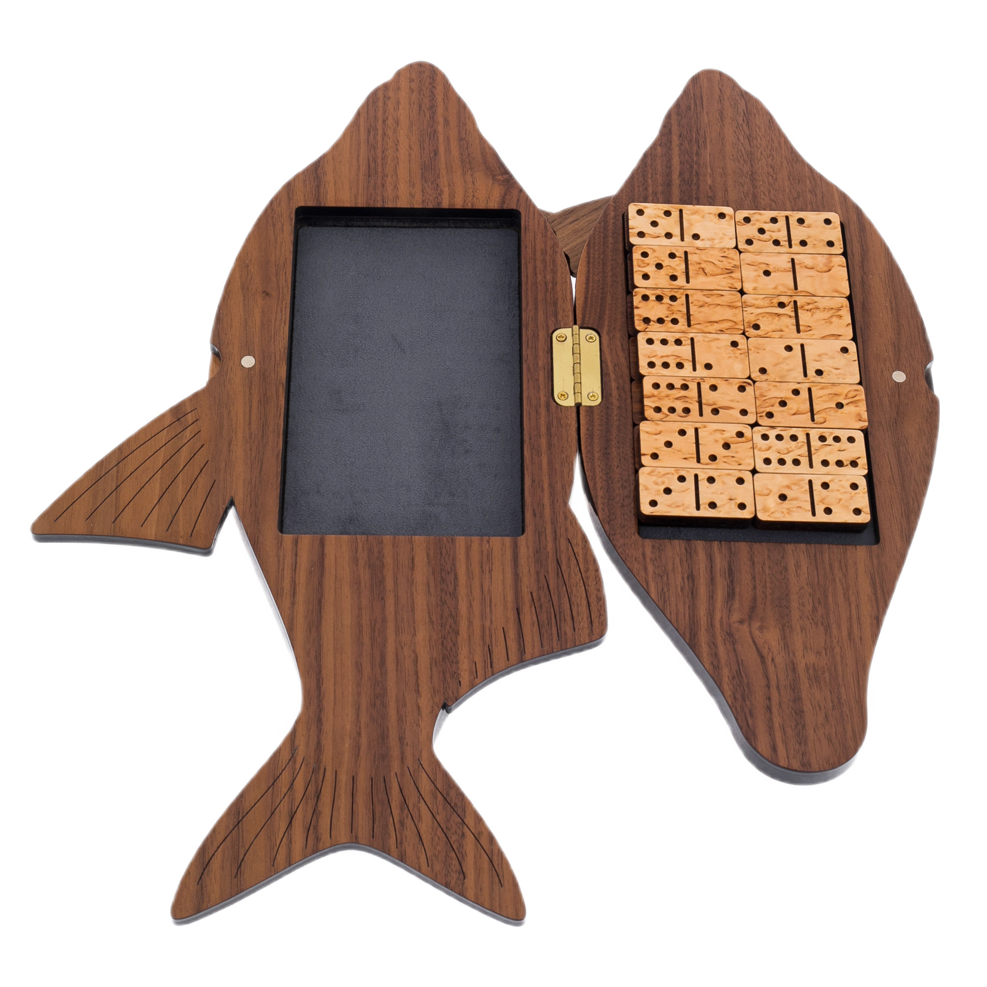 Домино из карельской берёзы, выполненное в форме рыбы, представляет собой изысканный аксессуар, объединяющий в себе функциональность и художественную выразительность. Необычная форма корпуса, повторяющая плавные очертания водного обитателя, придаёт игре особую атмосферу, превращая её в ритуал эстетического наслаждения. Каждая линия и изгиб тщательно продуманы, создавая гармоничный образ, который не только радует глаз, но и подчёркивает статус владельца, обладающего тонким вкусом и стремлением к уникальности.