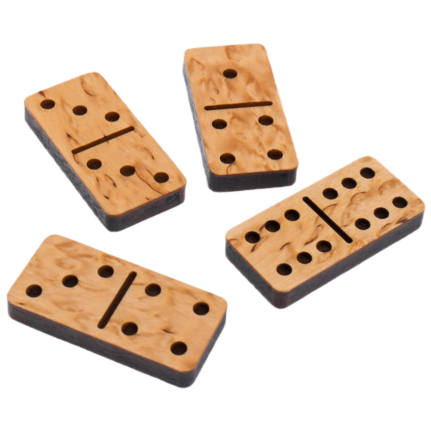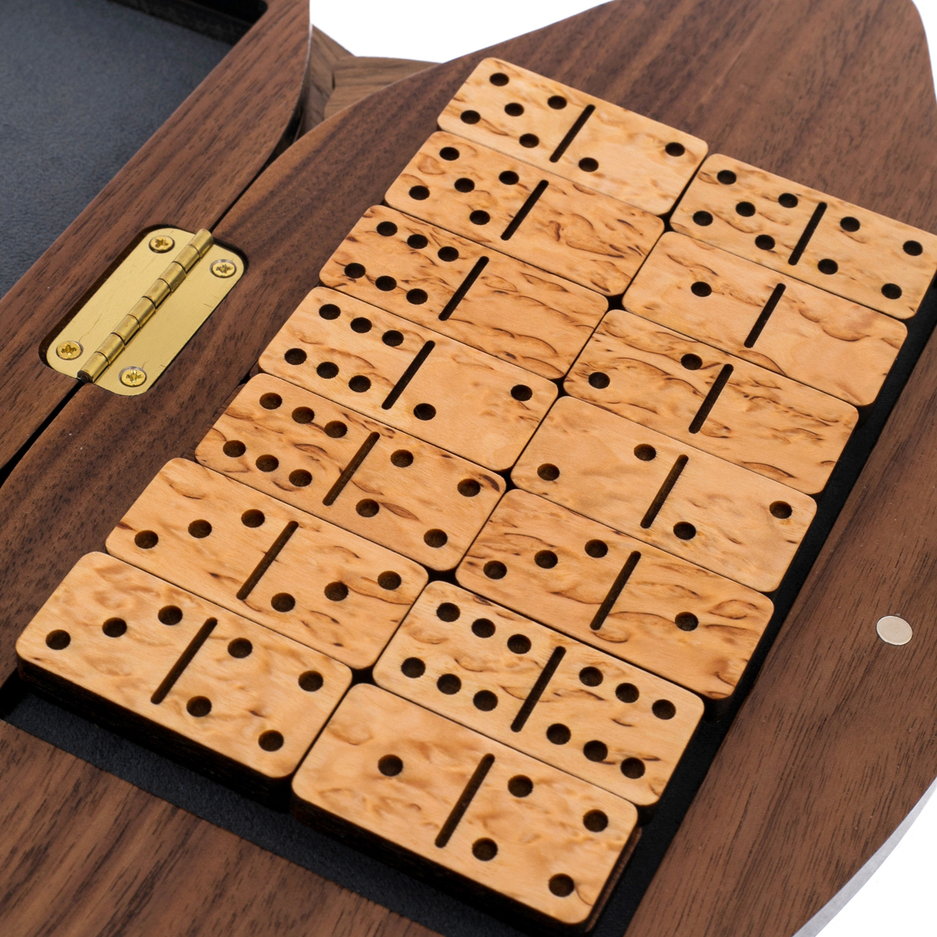 Основу изделия составляет карельская берёза, известная своей редкой фактурой и глубиной рисунка, дополненная элементами из благородной древесины тёмных оттенков, создающей выразительный контраст и подчёркивающей природную красоту материала. Внутреннее пространство раскрывается плавным движением, демонстрируя аккуратно уложенные фишки домино, выполненные из той же карельской берёзы с чёткой прорисовкой точек и линий, а также отделение для хранения, покрытое мягкой бархатистой тканью, обеспечивающей сохранность и комфорт при использовании. Надёжные металлические петли и магнитные фиксаторы гарантируют долговечность конструкции и удобство эксплуатации.