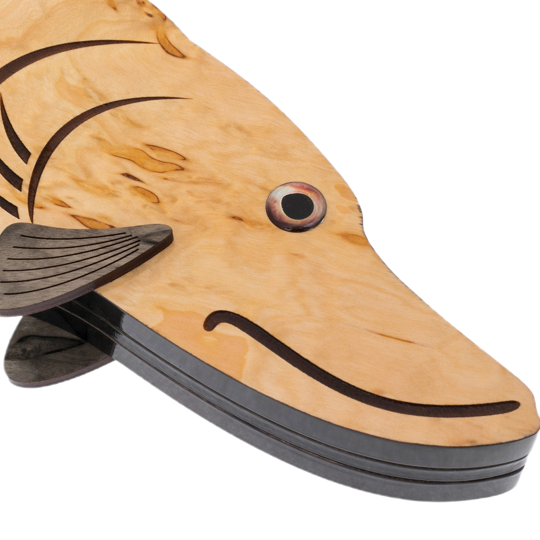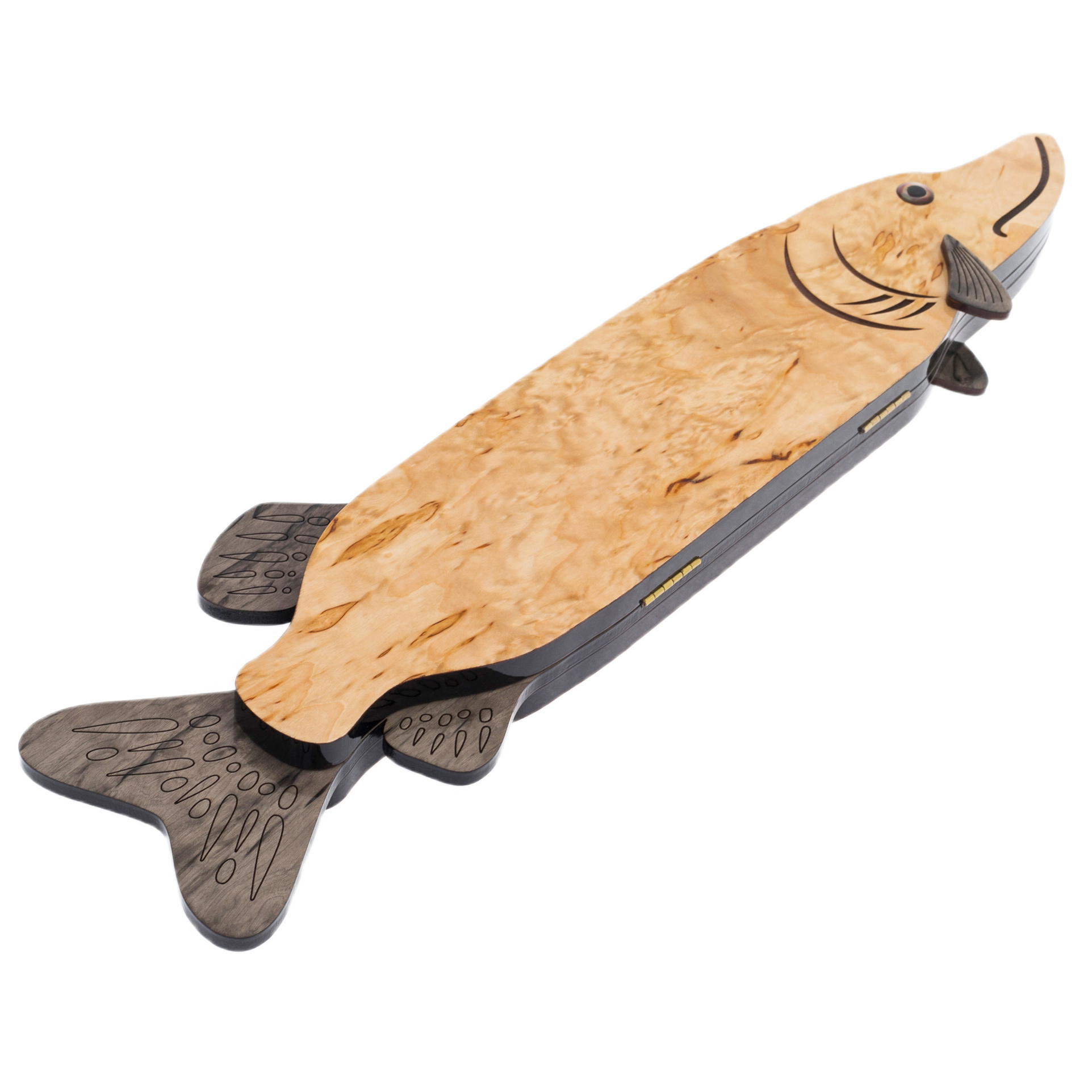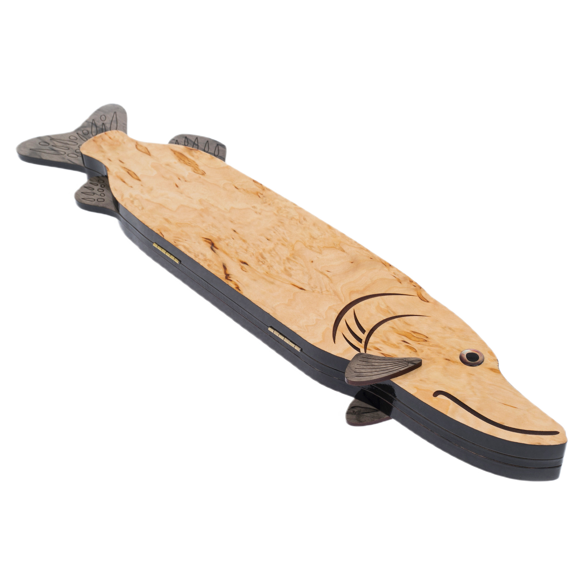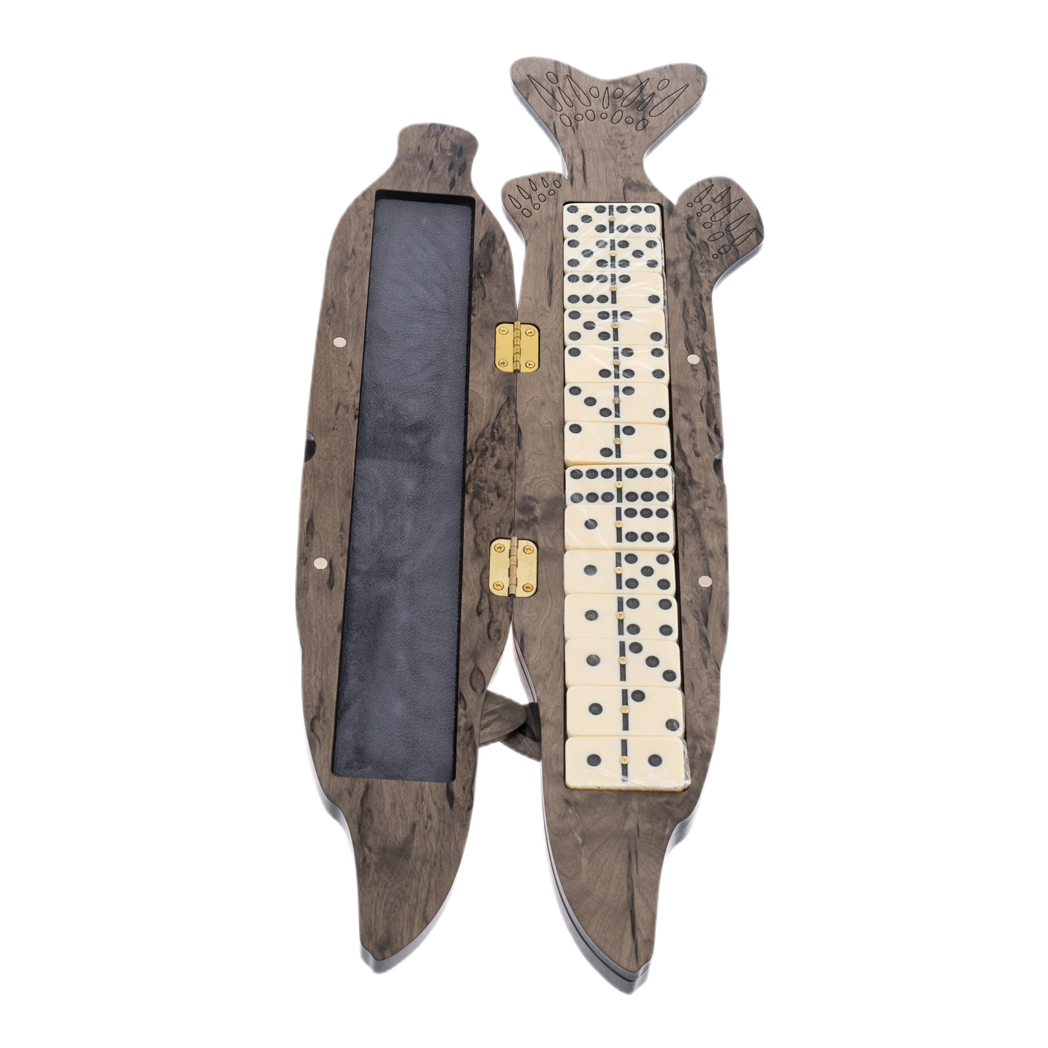 Домино из карельской берёзы, выполненное в форме щуки, представляет собой изысканный предмет, сочетающий в себе художественное мастерство и функциональность. Элегантный силуэт рыбы с тонко прорисованными деталями подчёркивает природную красоту древесины, а плавные линии и выразительный рисунок текстуры создают впечатление живого образа. Такое изделие превращает классическую игру в особый ритуал, наполняя каждый момент утончённой эстетикой и изяществом.