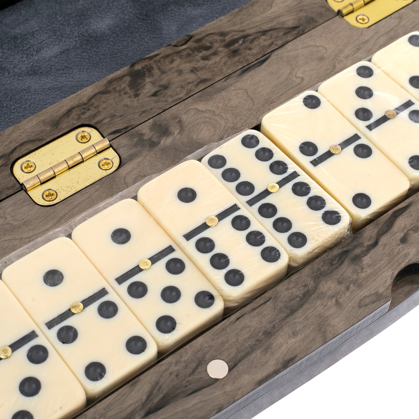 Карельская берёза с характерным узором и глубокими оттенками служит основой для корпуса, дополненного элементами из тёмной древесины, придающей контраст и выразительность. Внутреннее пространство скрывает тщательно выполненные фишки домино, изготовленные из высококачественных материалов с чёткой прорисовкой точек, а мягкая подкладка обеспечивает бережное хранение и удобство использования. Надёжные металлические петли и магнитные застёжки гарантируют долговечность и комфорт в эксплуатации, подчёркивая внимание к деталям и высочайший уровень исполнения.