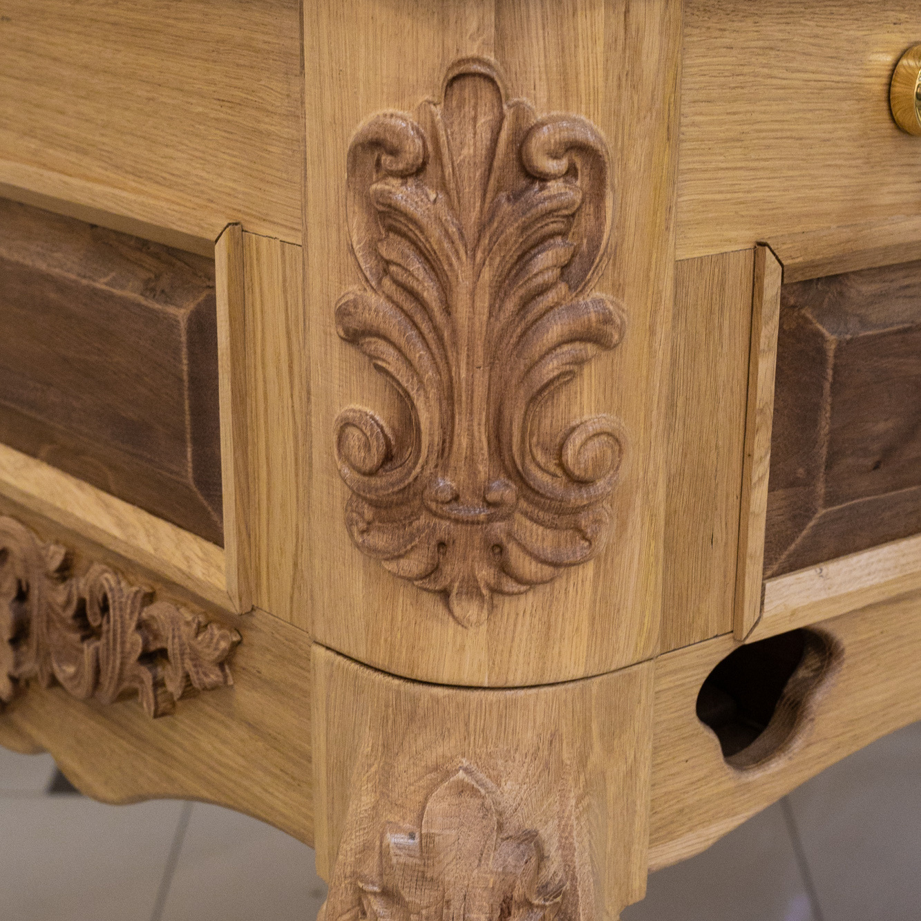 Materials:the table is oak, the handles are brass, hand polished or antique bronze.