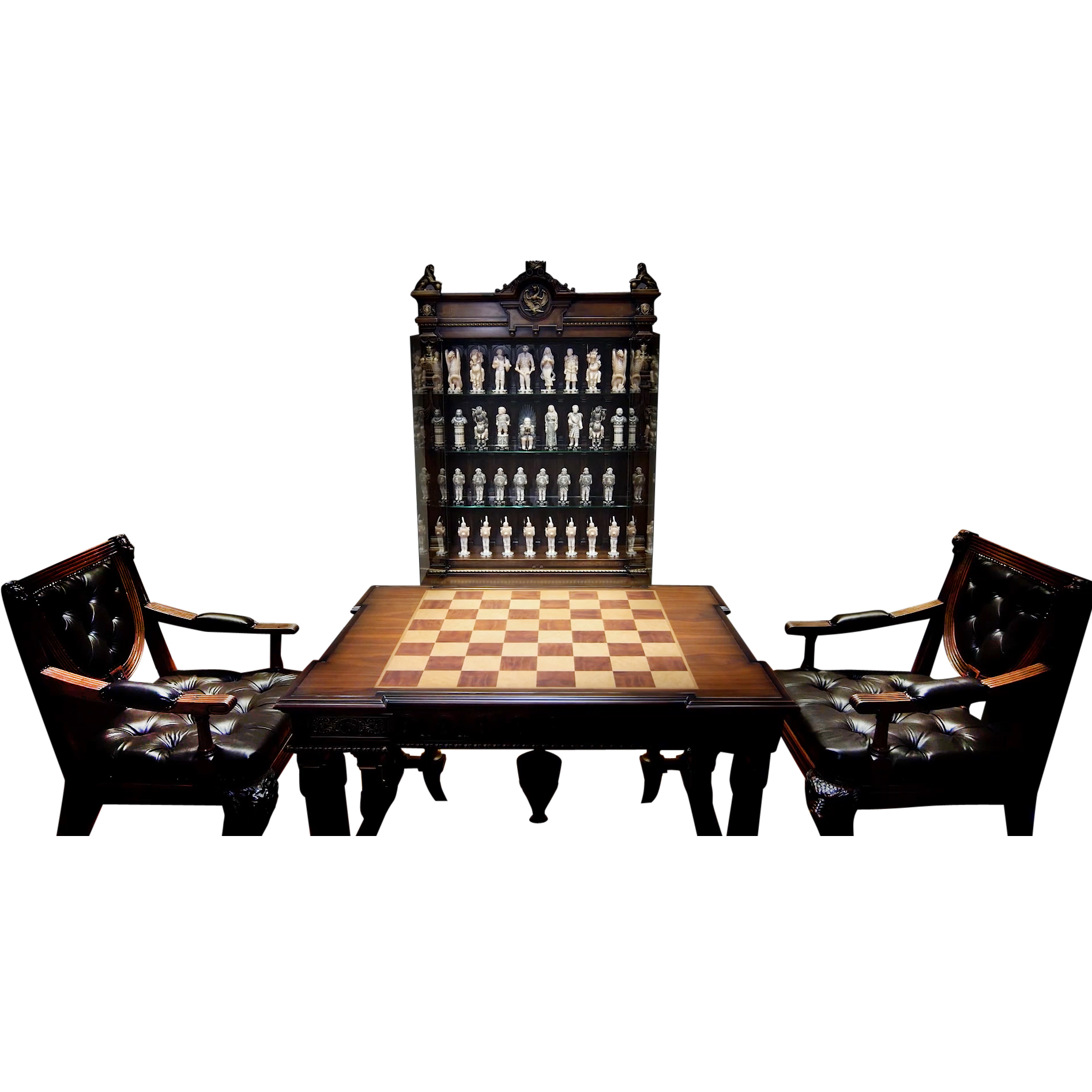 Materials: chairs - solid walnut, leather; table - solid walnut, walnut veneer, walnut root, yew veneer; showcase - solid walnut, walnut veneer, glass; figures - mammoth tusk, black obsidian, onyx, enamels.