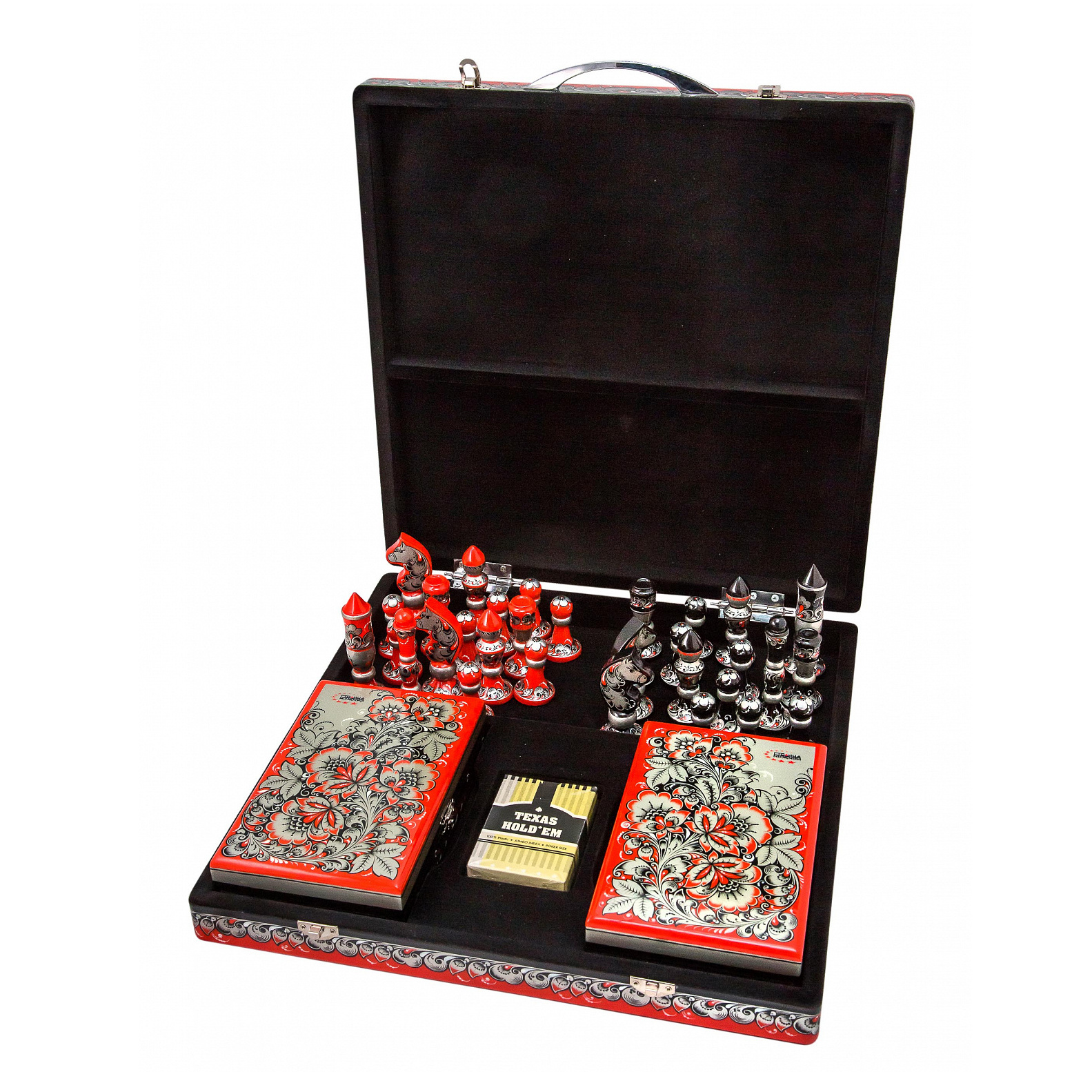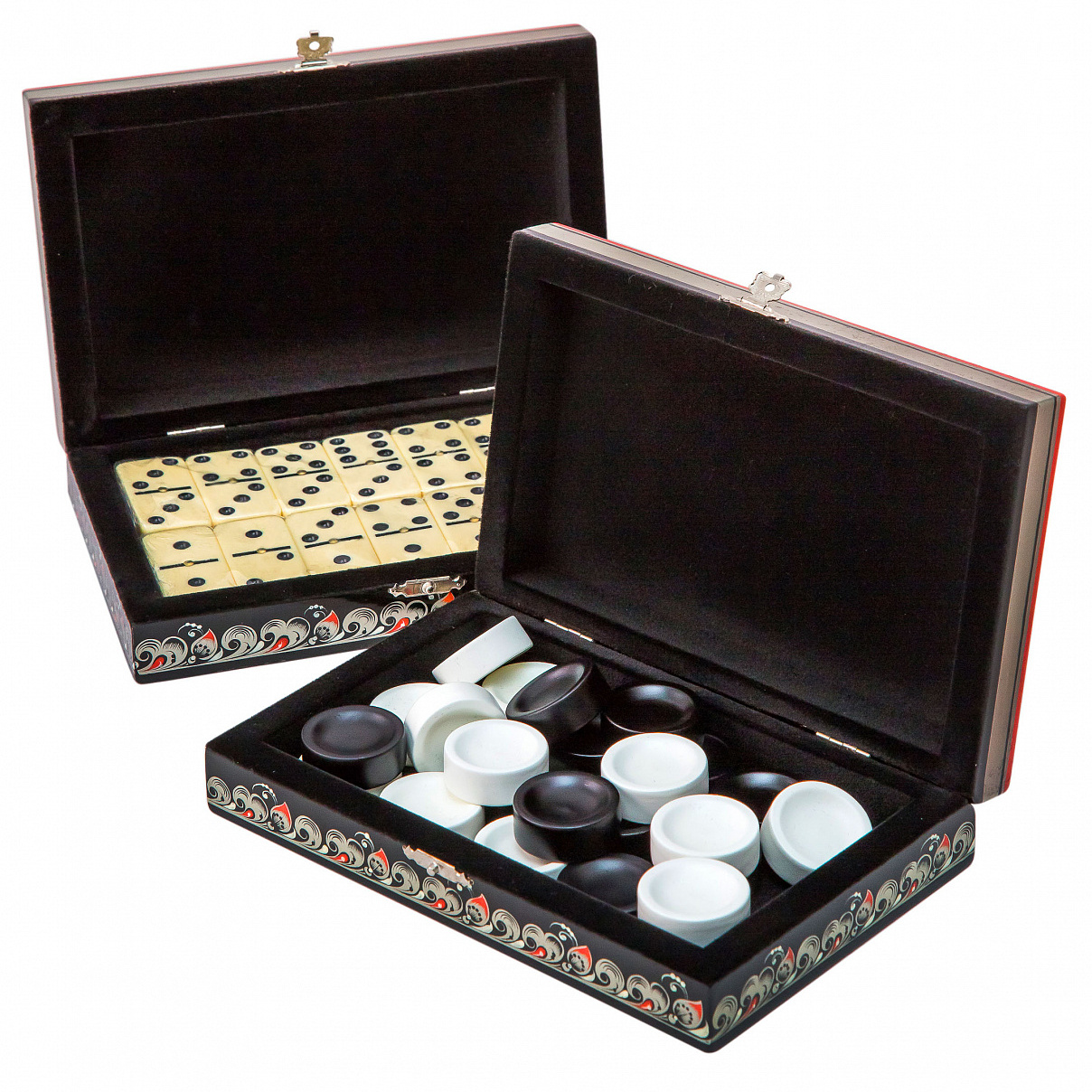 Dimensions:chessboard 400x400x64 mm., checkers box 191x126x40 mm., domino box 191x126x40 mm.