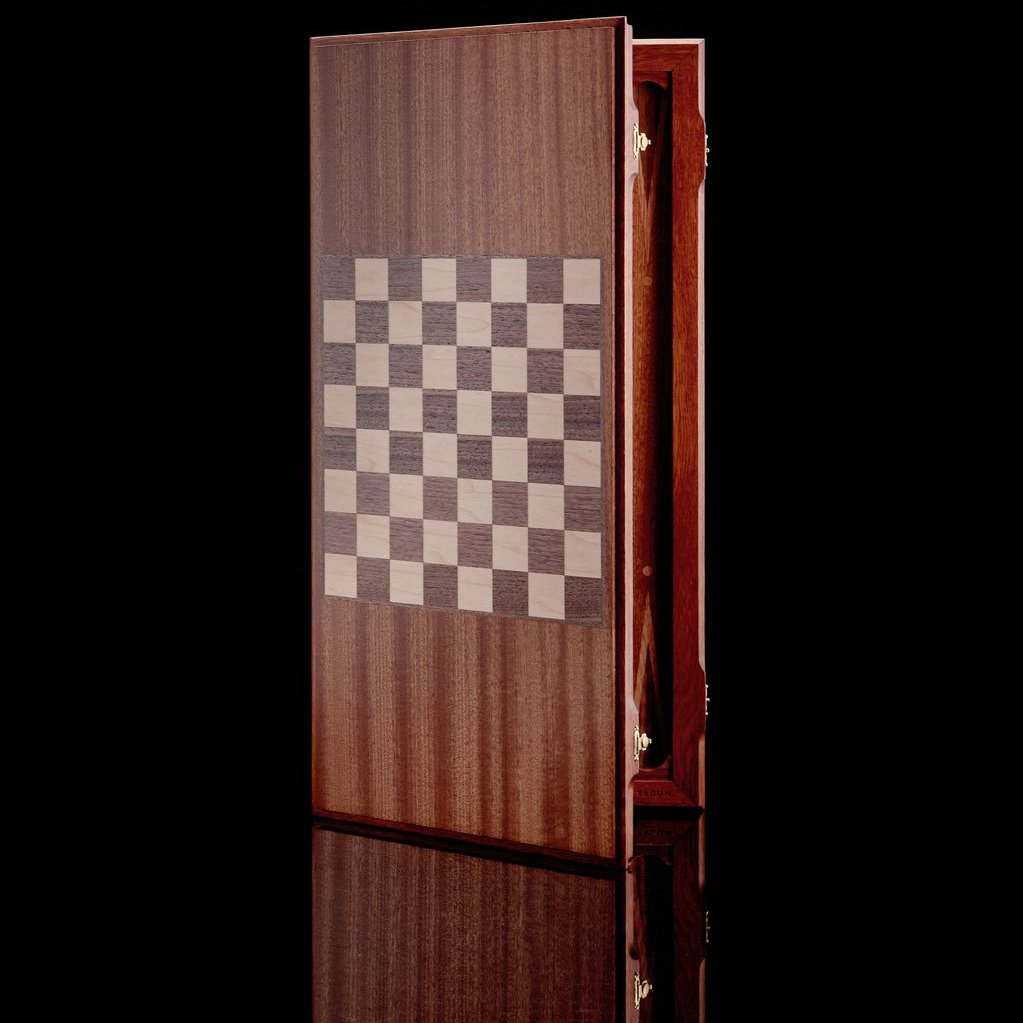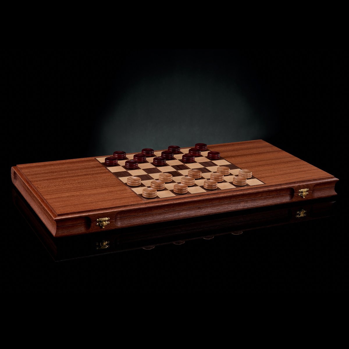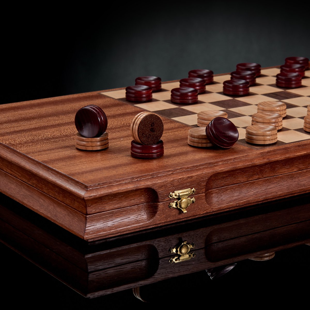 Checkers:the light ones are beech, the dark ones are tinted beech, glued with fabric. Diameter 30 mm, 30 pcs.