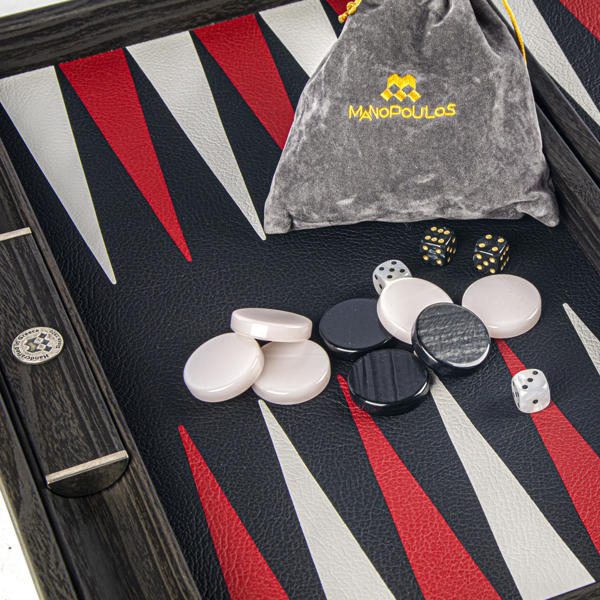 Package contents:backgammon, 30 mother-of-pearl checkers, 4 dice, 1 doubling cube, a set of wooden dice cups, a Manopoulos gift box.