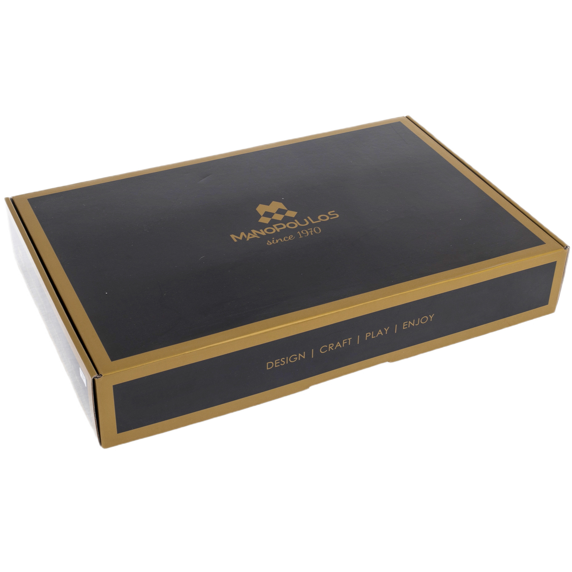 Package contents:backgammon, 30 mother-of-pearl checkers (15 brown and 15 white), 4 dice, 1 dice for doubling, a set of wooden dice cups, a Manopoulos gift box.
