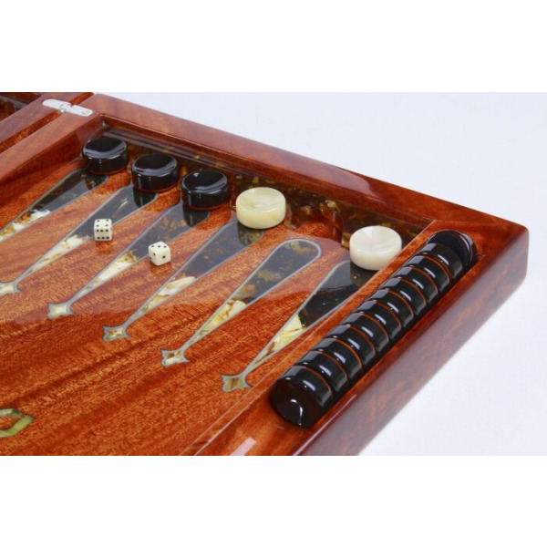 Backgammon made of Karelian birch and amber "Pearl of the East" of the Orient collectionBackgammon made of Karelian birch and amber "Pearl of the East" of the Orient collectionThe impeccable quality and exclusive design of elite backgammon will not leave indifferent a true connoisseur of good-quality and beautiful things! These backgammon are handmade from natural amber in the "Kovrov mosaic" technique. The texture of the materials is unique: it is impossible to make two completely identical backgammon. Amber composite of various shades is used for the manufacture of gaming accessories.