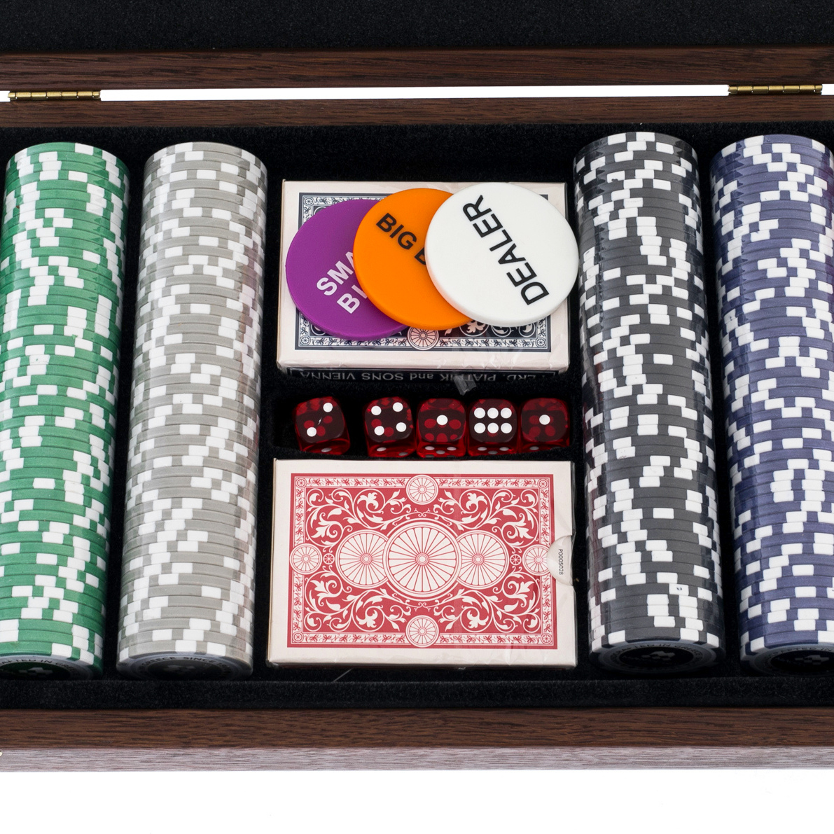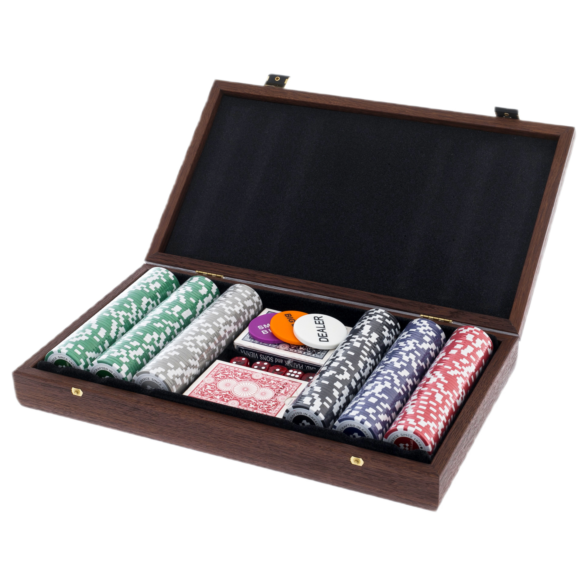 This luxurious poker set is handmade from wood and has a velvet tray inside.