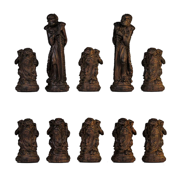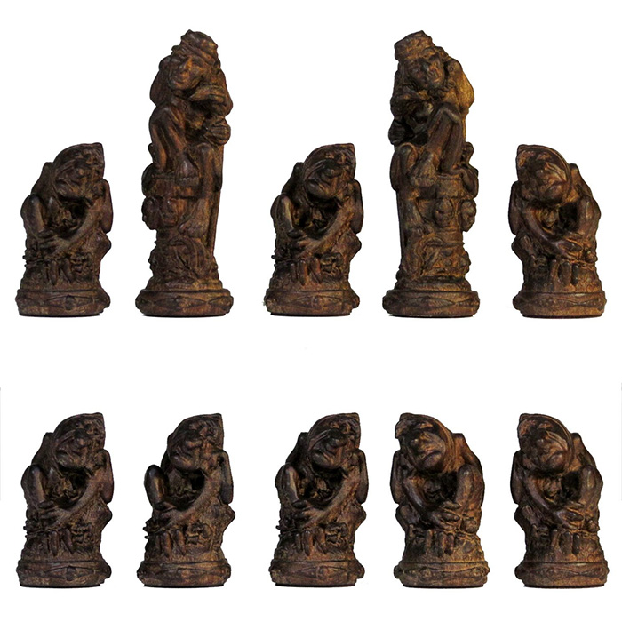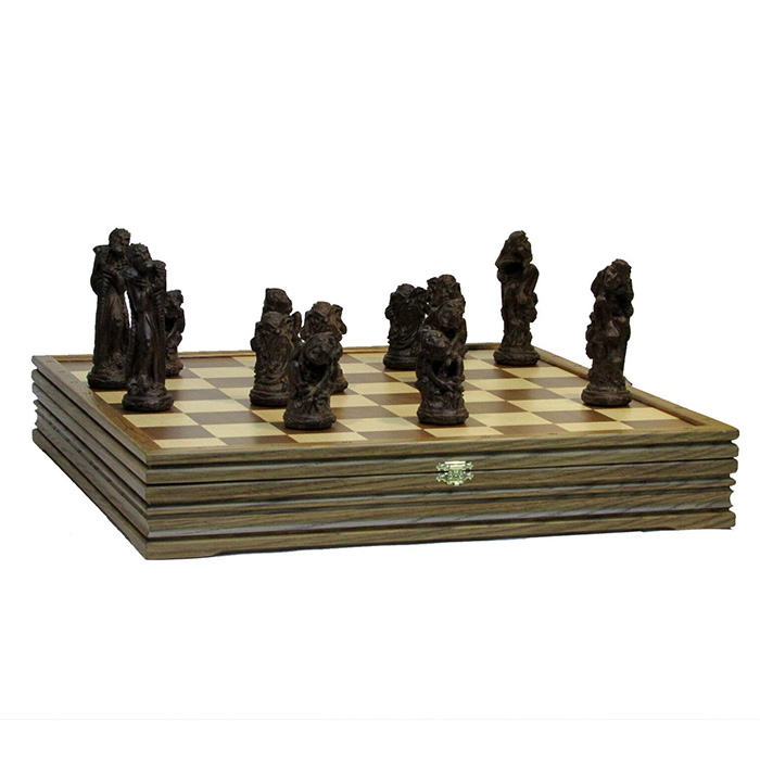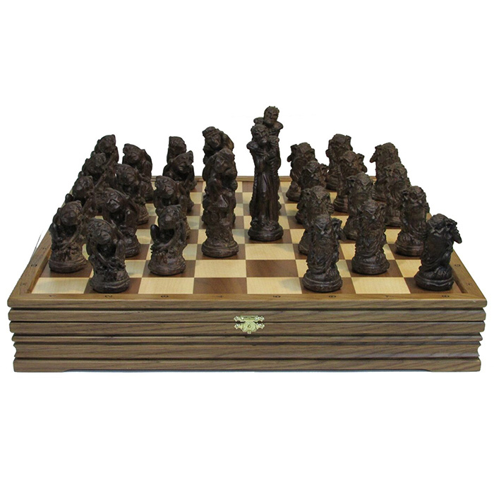 Этот оригинальный набор для шашек выполнен вручную из благородных пород дерева и адресован тем, кто ищет не просто настольную игру, а особую форму эстетического и интеллектуального удовольствия. Комплект включает 24 фигурки: 12 лесных кикимор и 12 леших, дополненных двумя яркими дамками — Бабой-Ягой и Кощеем. Противостояние построено на символической дуальности "женского" и "мужского" начал, воплощённых в загадочных мифических образах. Каждая фигура выточена из массива черного ореха, обработанного натуральным маслом, придающим поверхности матовую глубину, подчёркивающую изящество деталей резьбы.