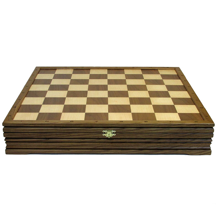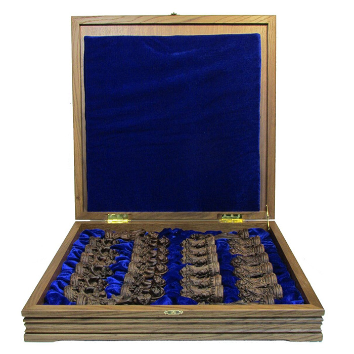Игровое поле выполнено вручную из черного дуба с чередующимися вставками шпона клена и американского ореха, образующими гармоничный ритм 57-миллиметровых клеток. Поверхность обрамлена индексацией, добавляющей нотку классики. Внутри доски предусмотрен мягкий ложемент, обитый синим бархатом, бережно фиксирующий каждую фигурку. Визуальная аскеза темного дерева в контрасте с насыщенным бархатом формирует образ достойного подарка — интеллектуального, ироничного, немного дерзкого.