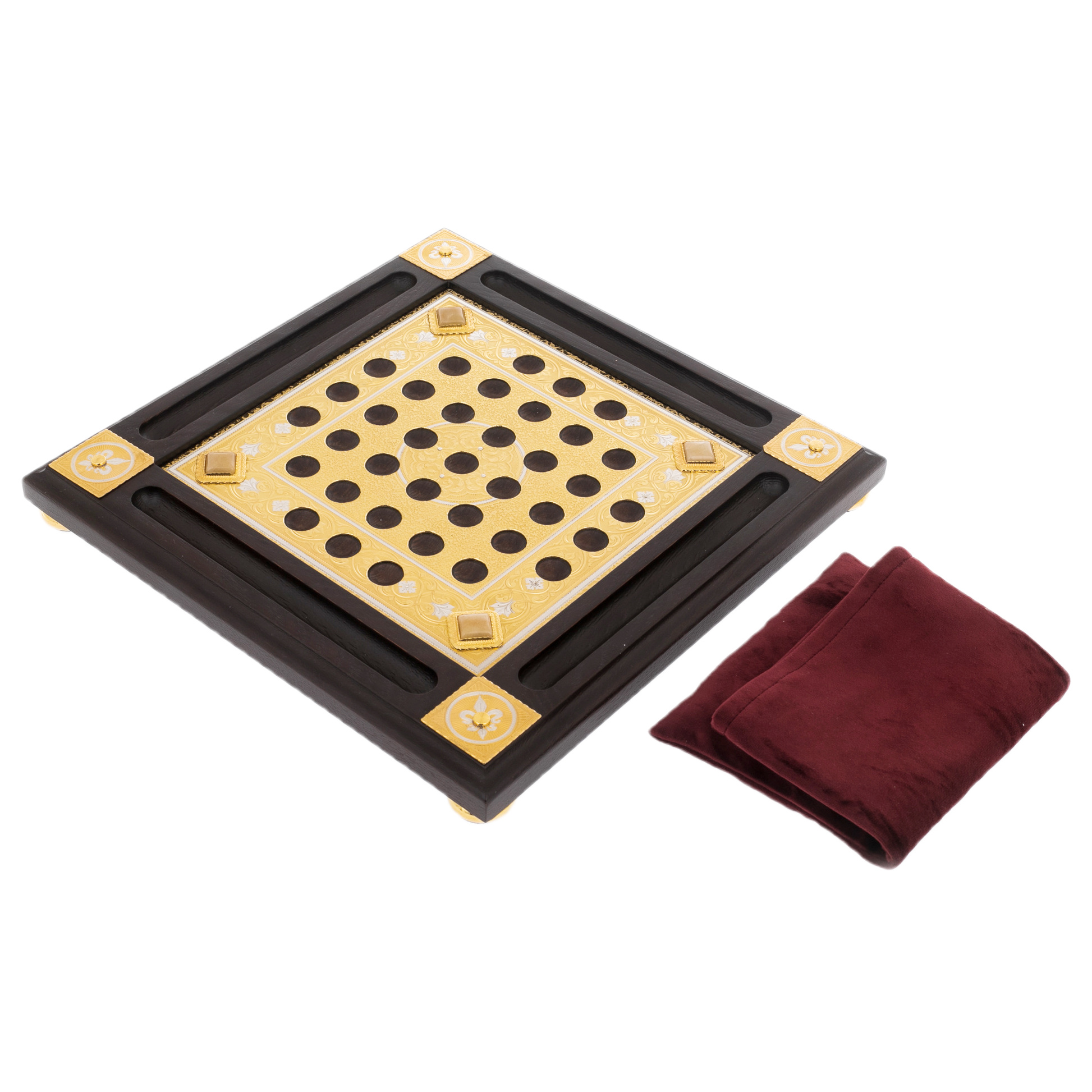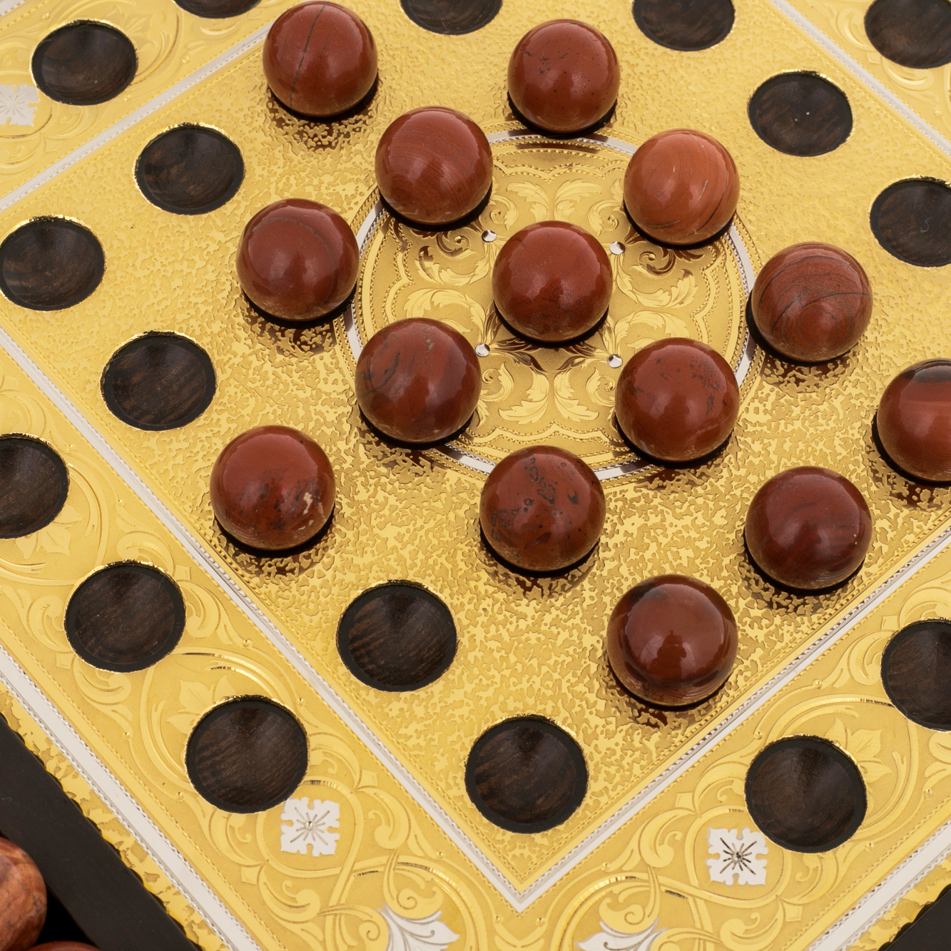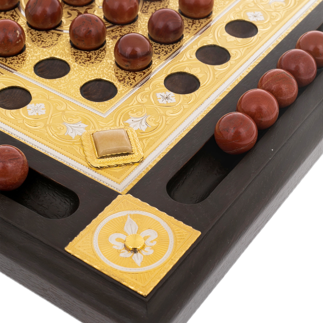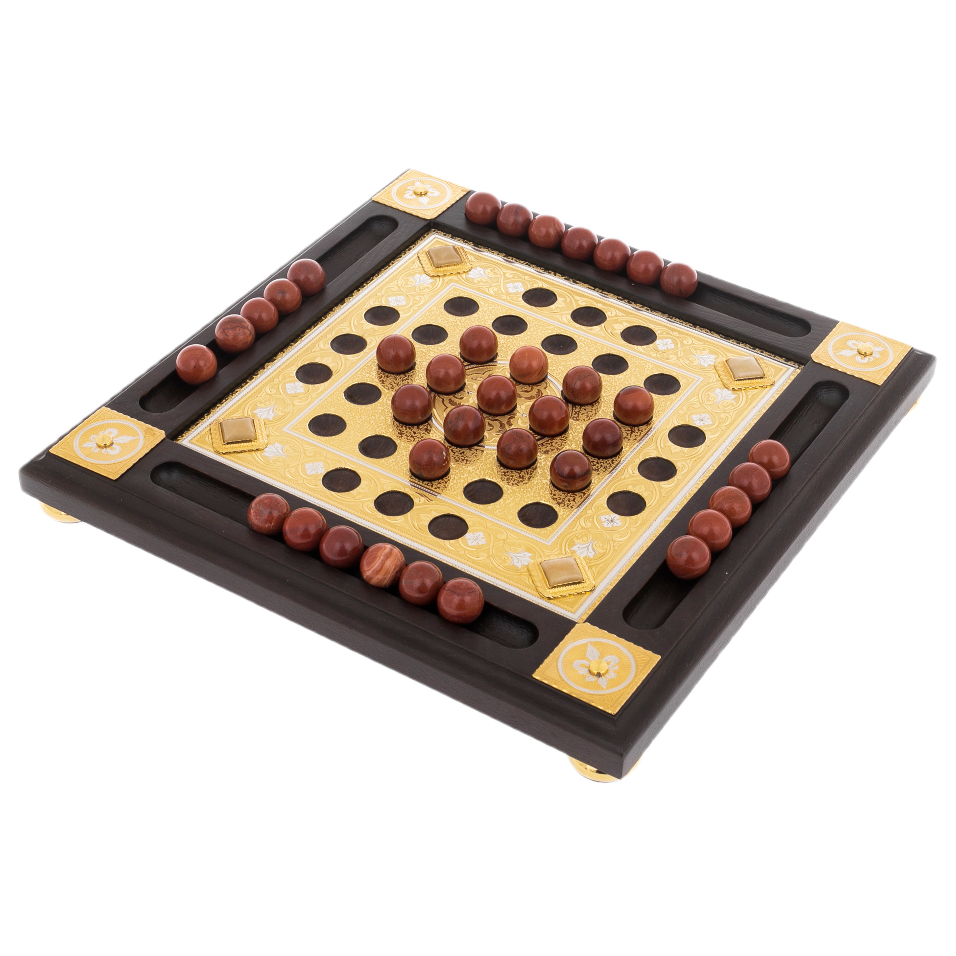 Настольная игра "Солонобле Премьер" с тигровым глазом — это изысканное воплощение интеллектуального досуга, созданное для тех, чья повседневность наполнена властью, принятием решений и чувством безупречного вкуса. Драгоценное сочетание благородного морёного дуба, сверкающего золота и завораживающих полудрагоценных камней превращает привычный игровой процесс в акт эстетического наслаждения. Поверхность игрового поля оформлена вручную, гладко отшлифованные лунки и фишки из яшмы легко скользят под кончиками пальцев, напоминая о прикосновении к предмету исключительного достоинства. Правила просты: заполните ячейки шарами, оставив одну пустой, а затем поочерёдно перепрыгивайте один шар другим в пустое пространство, убирая перепрыгнутый с поля. Разрешены ходы вперёд и назад, по горизонтали или вертикали — задача в том, чтобы остался один единственный шар в центре поля.