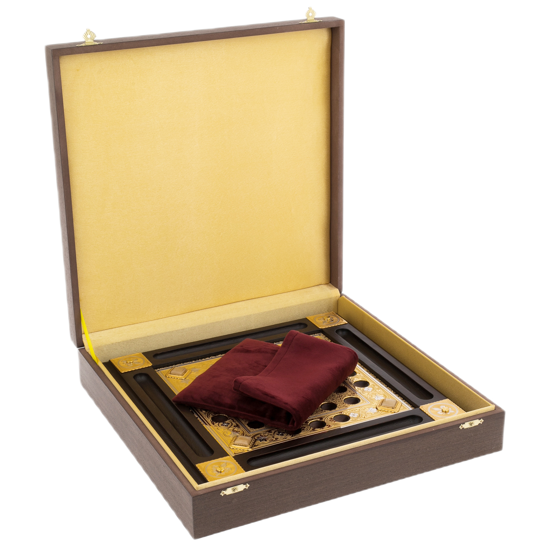 Златоустовская техника художественного оформления, применённая в этом изделии, придаёт игре не просто уникальный облик, а характер произведения искусства. Позолоченная поверхность украшена тончайшей гравировкой и сияющими серебряными элементами, дополненными вставками из тигрового глаза — камня, издавна ассоциирующегося с ясностью ума и твёрдостью воли. Ручная работа мастеров Златоуста отразилась в каждой линии, в каждом изгибе орнамента, в каждом отблеске света на металле. Тщательно выверенные пропорции, выверенная симметрия и декоративные углы усиливают ощущение гармонии и дают предмету тот вес, что так ценится в деловых подарках и предметах представительского уровня.