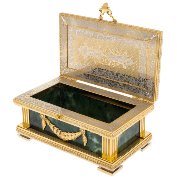 Zlatoust, not yet a city, but a factory, was founded at a time when Empress Elizabeth Petrovna, the youngest daughter of Peter I, ruled Russia. She tried to preserve all the progressive ideas of her father. The arrival of the Enlightenment era in Russia is connected with the time of Elizabeth Petrovna. The new Zlatoust plant was built precisely by decree signed by the Empress herself. A hundred years ago, when the city became famous not only for its unique blades, but also for the beauty of their decoration, a gift box was made in a truly royal style. She was sent to court, and the drawings and memories were preserved by Zlatoust artists. Today it is difficult to assess their authenticity, but this product was invented based on the motives – all in the same royal style. The caskets are based on the famous Ural gems. About a thousand different minerals have been found in the depths of the Ural Mountains. References to the search for precious stones in these places have been found since the XVIII century. The Urals is especially famous for its precious, semi-precious and ornamental stones. In the Urals, emerald, garnet, amethyst, aquamarine, jasper, rhodonite, malachite, serpentine, orlet and many others are mined, amazingly beautiful and famous all over the world. The first valuable rocks were mined and processed by local artisans who created their own traditions. Later, jewelers trained according to European standards joined in. Ural precious stones are usually of very high quality. They make rare jewelry, which is given its due in all corners of the world.