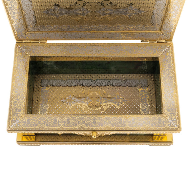 Amber casket "Princely"Amber casket "Princely"The luxurious jewelry box is made of natural amber. The lid of the product is decorated with the Russian coat of arms made of jewelry bronze. This stylish accessory is finished on all sides with a bronze decor, cast by the method of artistic casting. The legs are made in the form of amber acorns topped with a bronze plume with leaves. The souvenir is also available in silver.