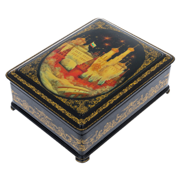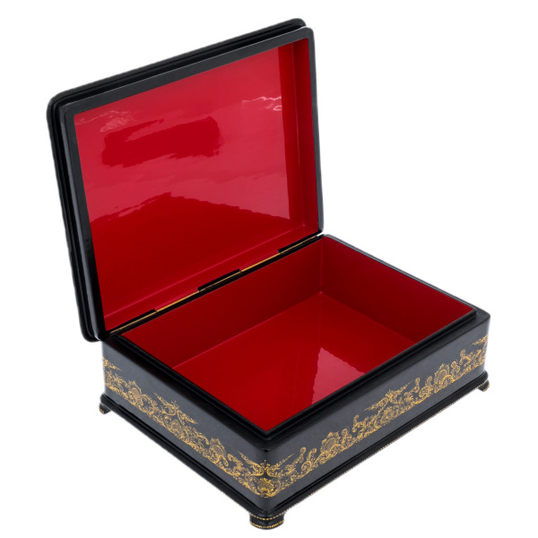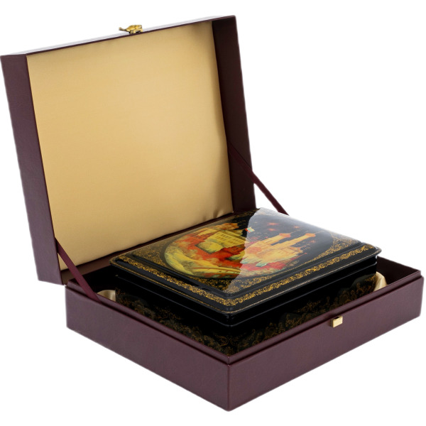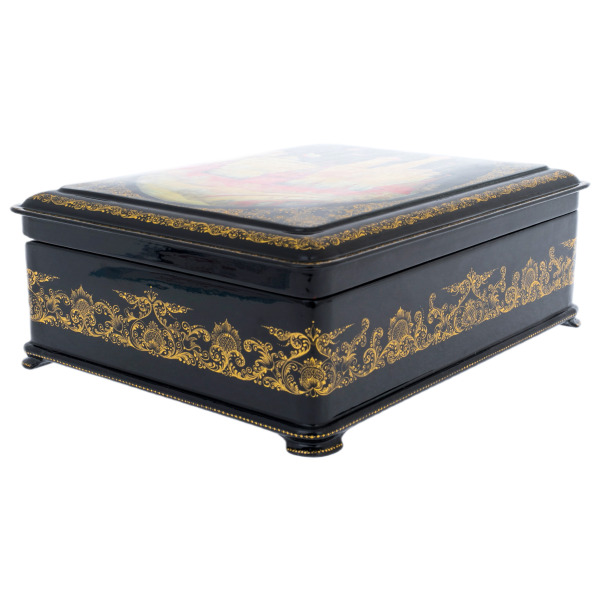 Это произведение палехских мастеров, выполненное в технике традиционной лаковой миниатюры, изначально создававшейся для самых взыскательных ценителей русского искусства. Корпус шкатулки формируется из прочной папье-маше, проходящего многоступенчатую сушку и покрываемого глубоким чёрным лаком, создающим эффект бездонной глянцевой поверхности. Внутреннее пространство выстлано густым красным лаком, контрастирующим с тёмным внешним блеском и подчёркивающим ощущение камерной драгоценности.