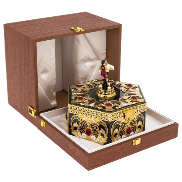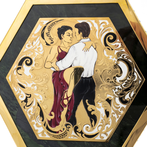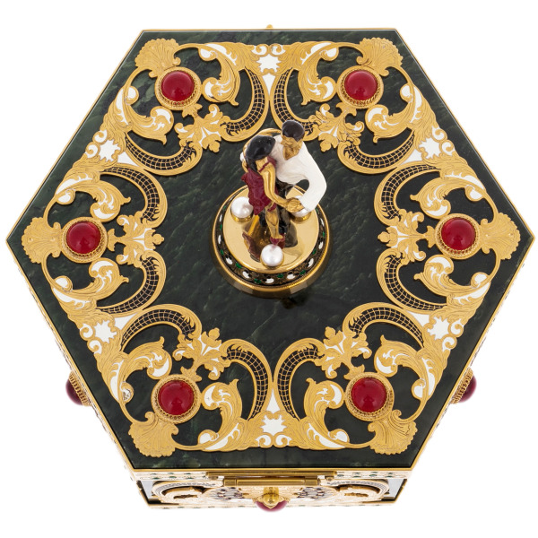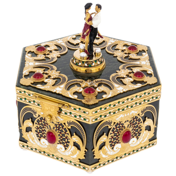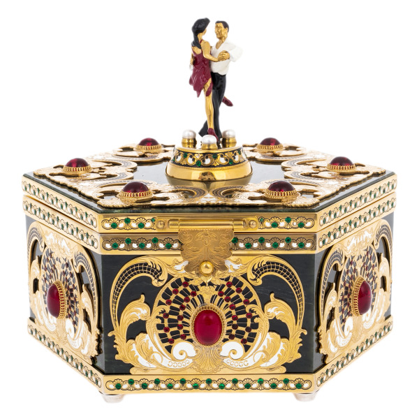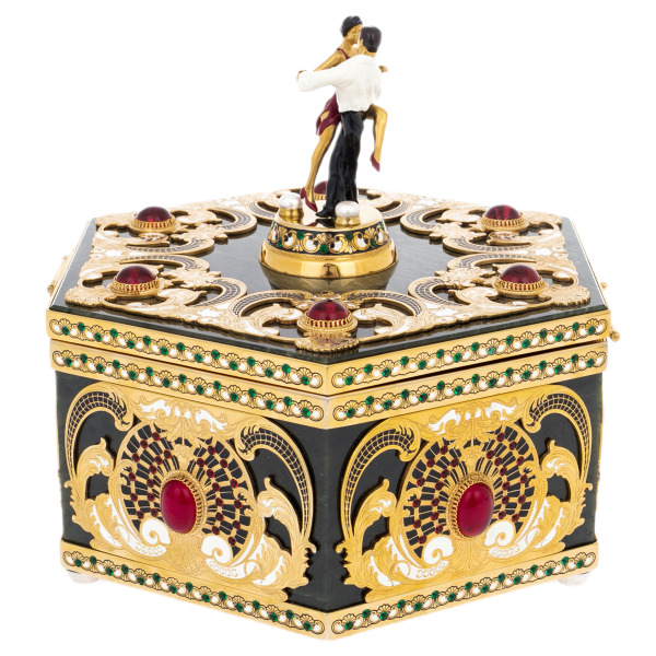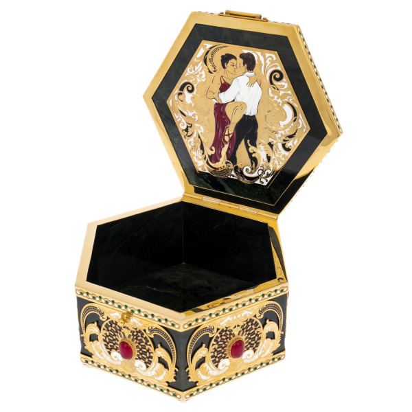 Верхняя плоскость украшена шестиугольной композицией, создавшей обрамление для миниатюрной скульптуры двух танцоров. Фигуры, выполненные в яркой ручной росписи, передают движение, эмоцию и выверенную пластику танго, придавая всей шкатулке характер произведения, созданного для созерцания. Эмалевые элементы, жемчужные вставки, барочный узор, гравировка — каждая деталь исполнена с предельной аккуратностью, подчёркивающей ручной труд мастеров. Крышка поднимается плавно, открывая внутреннее пространство, облицованное нефритом, а с обратной стороны взгляд встречает ещё одну миниатюру — изображение пары в танце, выполненное в той же стилистике.
