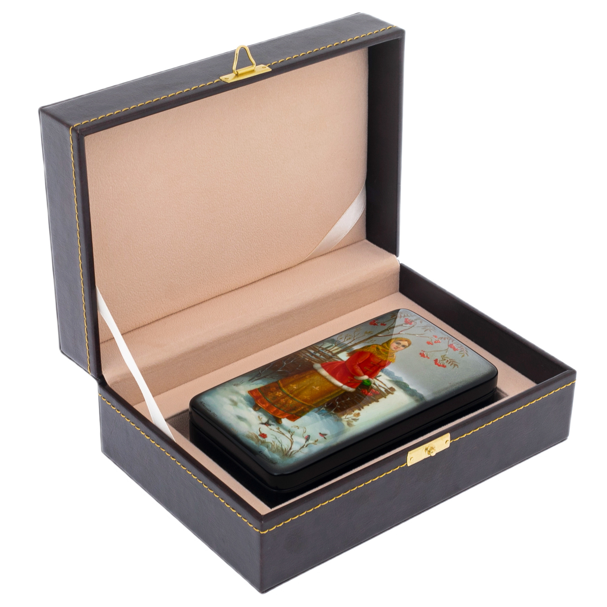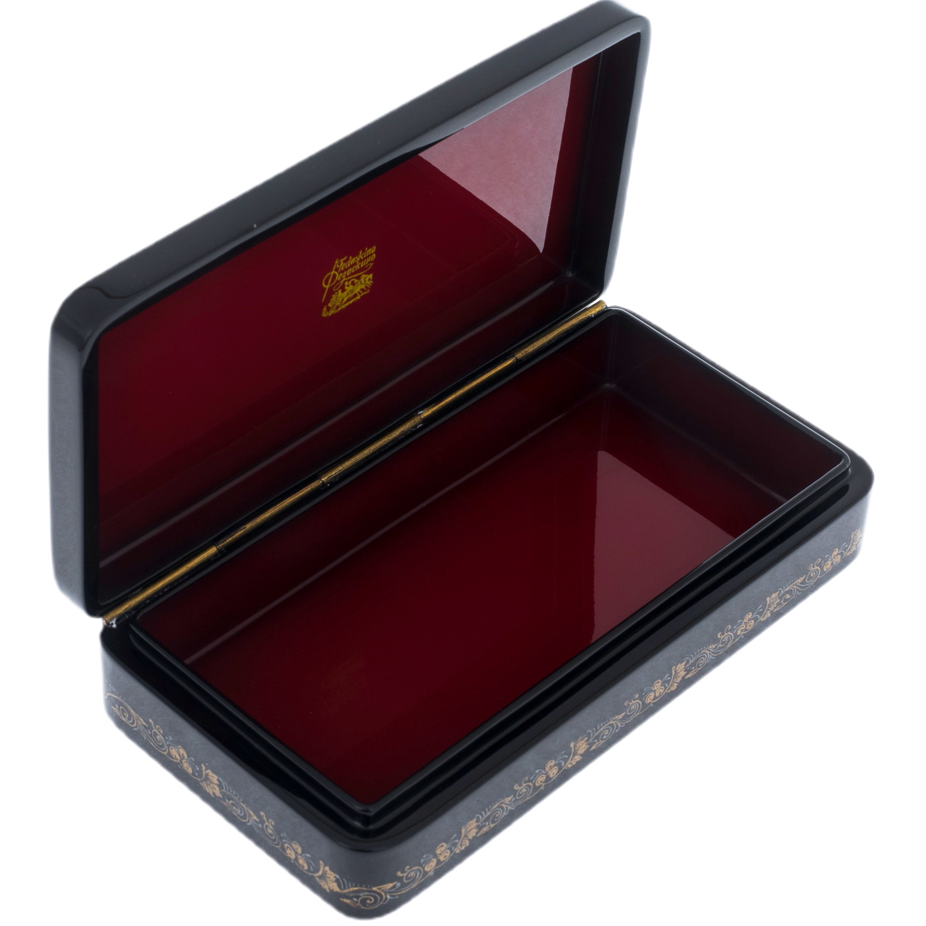 The delicate radiance of the lacquer on the inside of the box recalls the candlelight warming on a winter evening, and the warmth of the soul that is stored inside. The surface of the box, covered with several layers of varnish, creates a depth effect, allowing the eye to immerse itself in a world of exquisite beauty, as if in a mythical fairy tale.