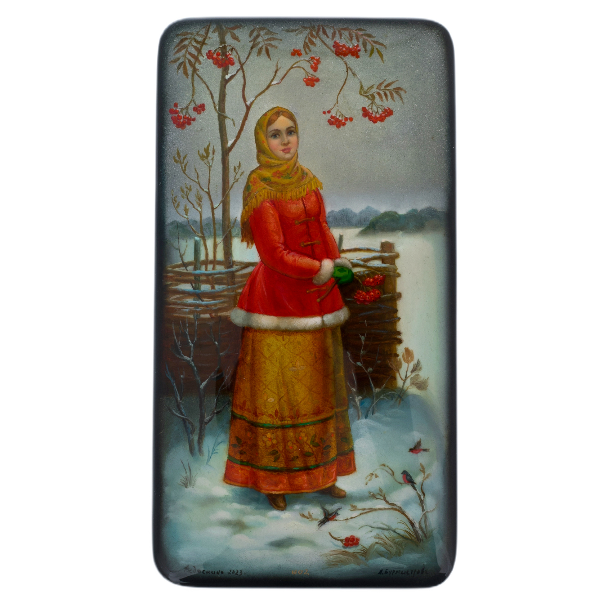 The front side depicts a young girl in a traditional Russian costume holding a red-orange bunch of rowan berries. Bright as frozen drops of blood, they symbolize life, warmth and well-being breaking through the cold.