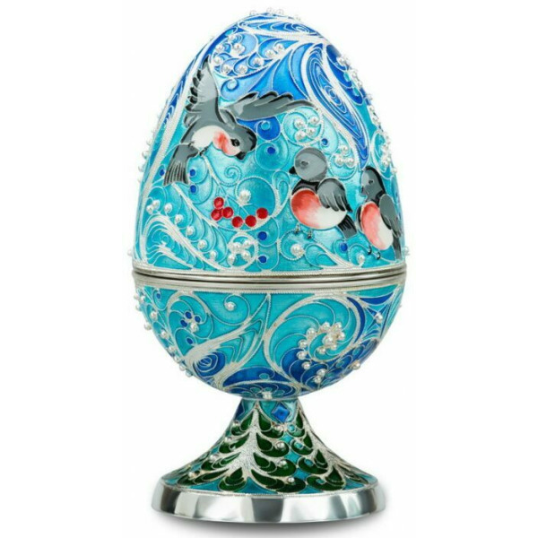 Russian Gems Jewelry box-egg "White wave" Jewelry box-egg "White wave" Despite the fact that the art of creating cloisonne enamel comes from Byzantium, it was Russian jewelers who perfected this unique technique in the 19th century. Faberge, P.A. Ovchinnikov). Objects cast from silver are covered with the finest relief pattern of silver threads. Then an enamel pattern is applied inside the contour and the entire product is covered with glaze paint. About 20 craftsmen work on each subject. The process is very laborious, but the result is worth it, because the created object is a work of art.