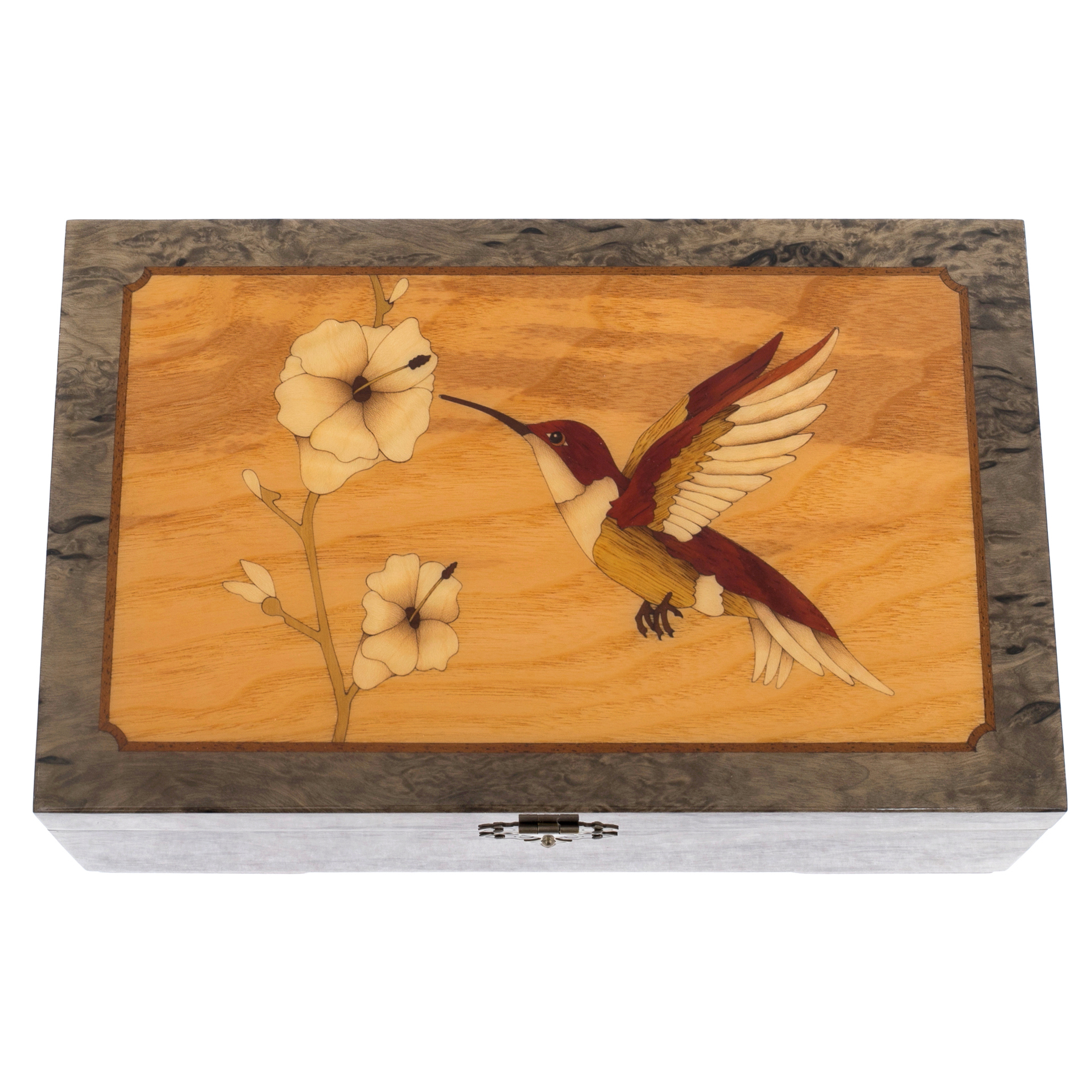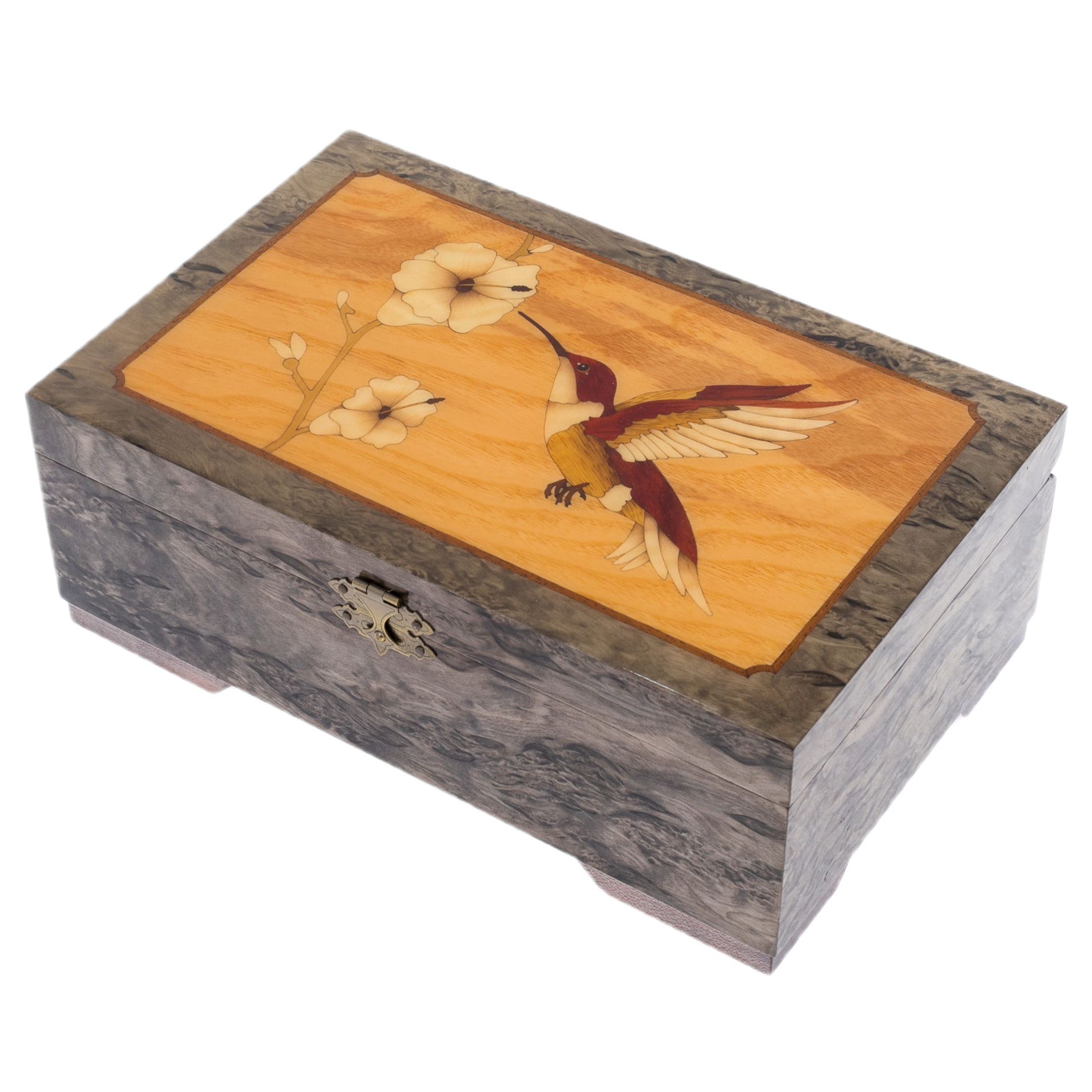 Шкатулка для украшений из карельской берёзы с изящным изображением колибри представляет собой уникальное произведение искусства, служащее вместилищем для самых изысканных драгоценностей. Лаконичная форма и утончённые линии корпуса подчёркивают благородство природного материала, а лёгкая игра оттенков древесины создаёт ощущение живой текстуры, манящей своим теплом и глубиной. Каждая деталь, от аккуратной металлической застёжки до изящных ножек, несёт в себе идею гармонии и совершенства, обращаясь к взыскательному вкусу истинных ценителей.