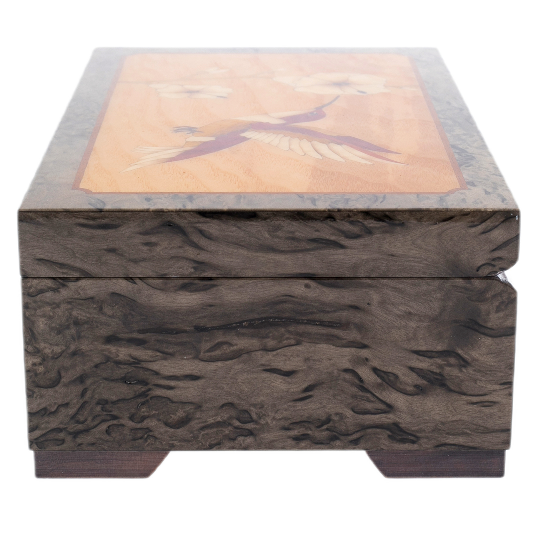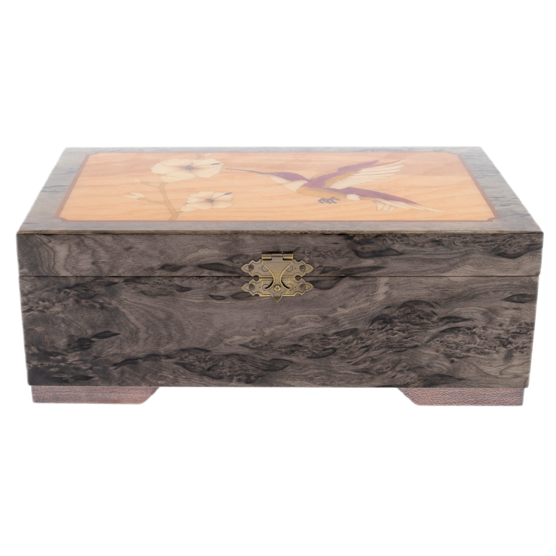 Карельская берёза, обладающая редкой структурой и насыщенным рисунком годичных колец, служит основой для создания этой шкатулки, а инкрустация из древесных пород, мастерски выложенная в виде колибри, придаёт изделию художественную выразительность и неповторимость. Внутреннее пространство оформлено мягкой тканевой подкладкой, защищающей украшения от царапин и повреждений, что подчёркивает заботу о сохранности и презентабельности каждой драгоценности. Тщательный выбор материалов и безупречное исполнение свидетельствуют о высоком профессионализме мастеров, вложивших душу в создание этого шедевра.