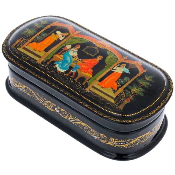 Вся поверхность украшена тончайшей ручной росписью, выполненной натуральными пигментами и золотом, растёртым до состояния мягкой светящейся пыли. Мастера, работающие над такими вещами, используют традиционные приёмы палехской школы — миниатюрные мазки, крошечные штрихи, многослойные прозрачные лессировки. Благодаря этому изображения приобретают характерную воздушность, глубину и узнаваемую по всему миру изящную декоративность. Золотой орнамент, обрамляющий композицию, создаётся особо тонкими кистями и требует безукоризненной точности движений.