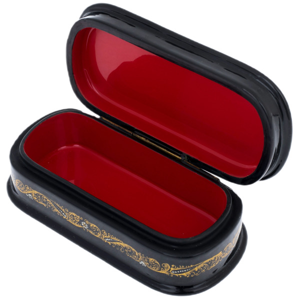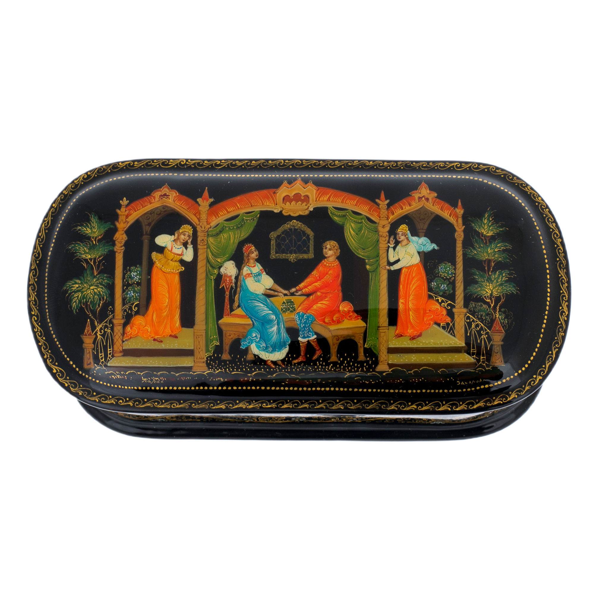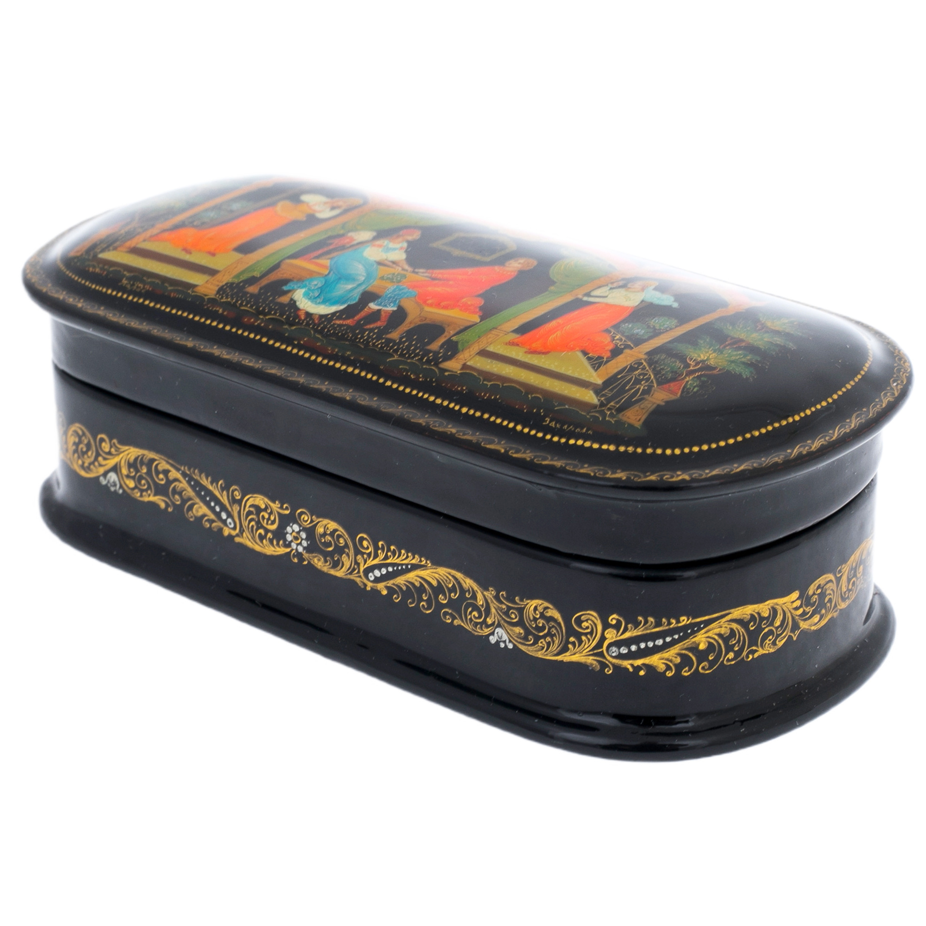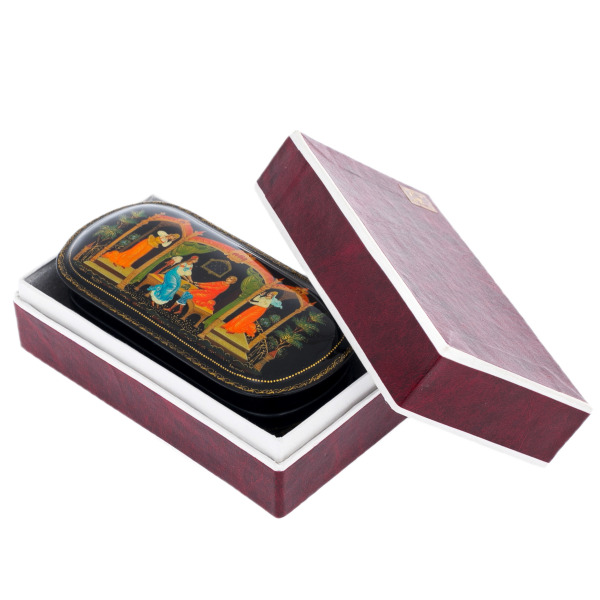 Это произведение палехских мастеров, выполненное в технике традиционной лаковой миниатюры, изначально создававшейся для самых взыскательных ценителей русского искусства. Корпус шкатулки формируется из прочной папье-маше, проходящего многоступенчатую сушку и покрываемого глубоким чёрным лаком, создающим эффект бездонной глянцевой поверхности. Внутреннее пространство выстлано густым красным лаком, контрастирующим с тёмным внешним блеском и подчёркивающим ощущение камерной драгоценности.