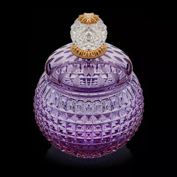 Художественная выразительность изделия раскрывается через сложную геометрию огранки и игру света, характерную для высококачественного хрусталя. Поверхность шкатулки преломляет свет, создавая переливы от глубоких аметистовых тонов к прозрачным граням. Металлические элементы из бронзы с позолотой подчёркивают форму и придают изделию торжественное звучание, а аккуратные декоративные акценты усиливают ощущение ювелирной проработки. Использование оникса в отделке добавляет композиции глубину и контраст, усиливая визуальное восприятие.