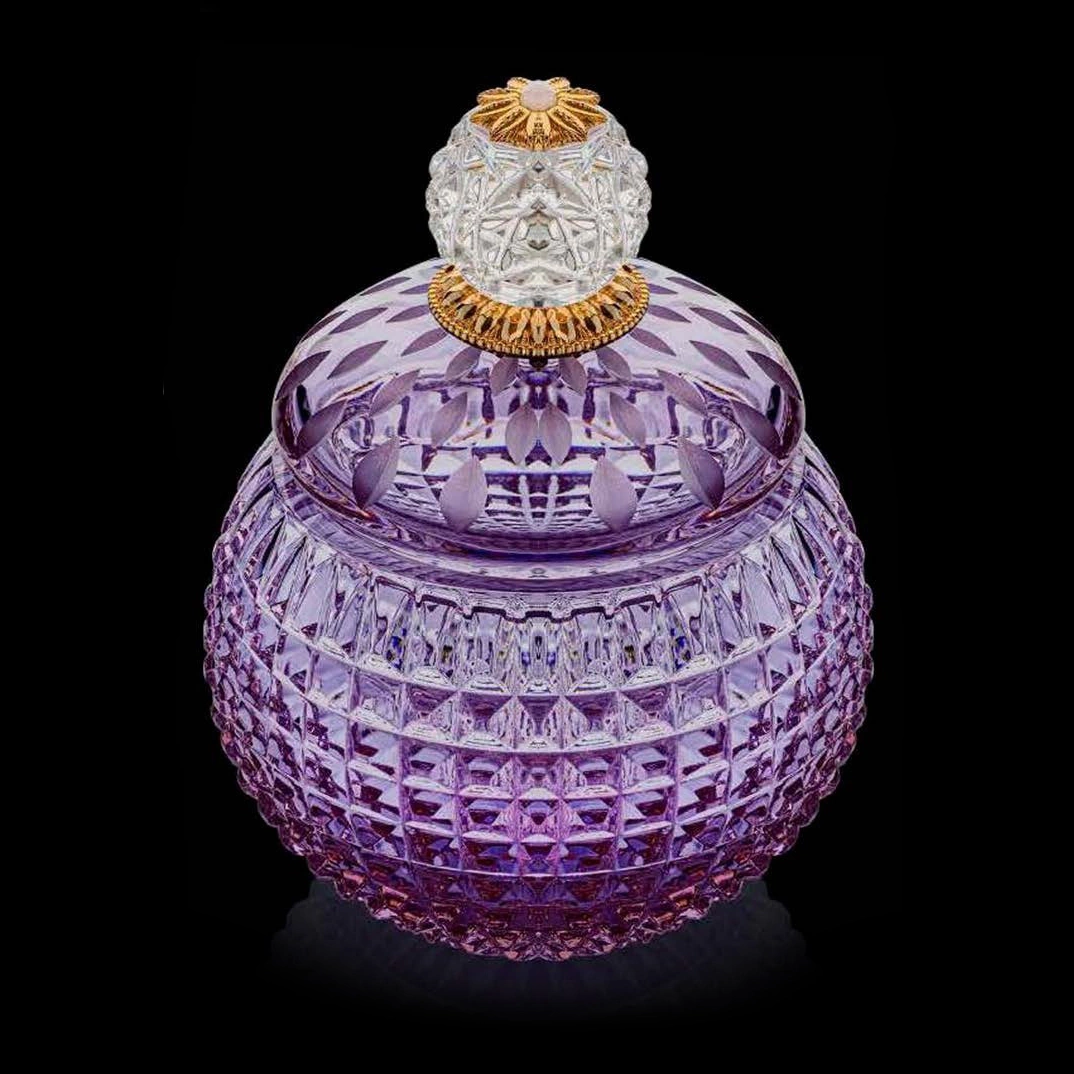 Шкатулка хрустальная «Luce» фиолетовая, созданная во флорентийской мастерской в Италии, представляет собой изысканный предмет, в котором утончённая декоративность соединена с благородством материалов. Основание выполнено из гранёного хрусталя с насыщенным фиолетовым оттенком, создающим эффект глубины и мягкого внутреннего свечения. Крышка дополнена выразительным навершием с кристаллической огранкой и металлическими элементами с позолотой, формирующими гармоничную и завершённую композицию.