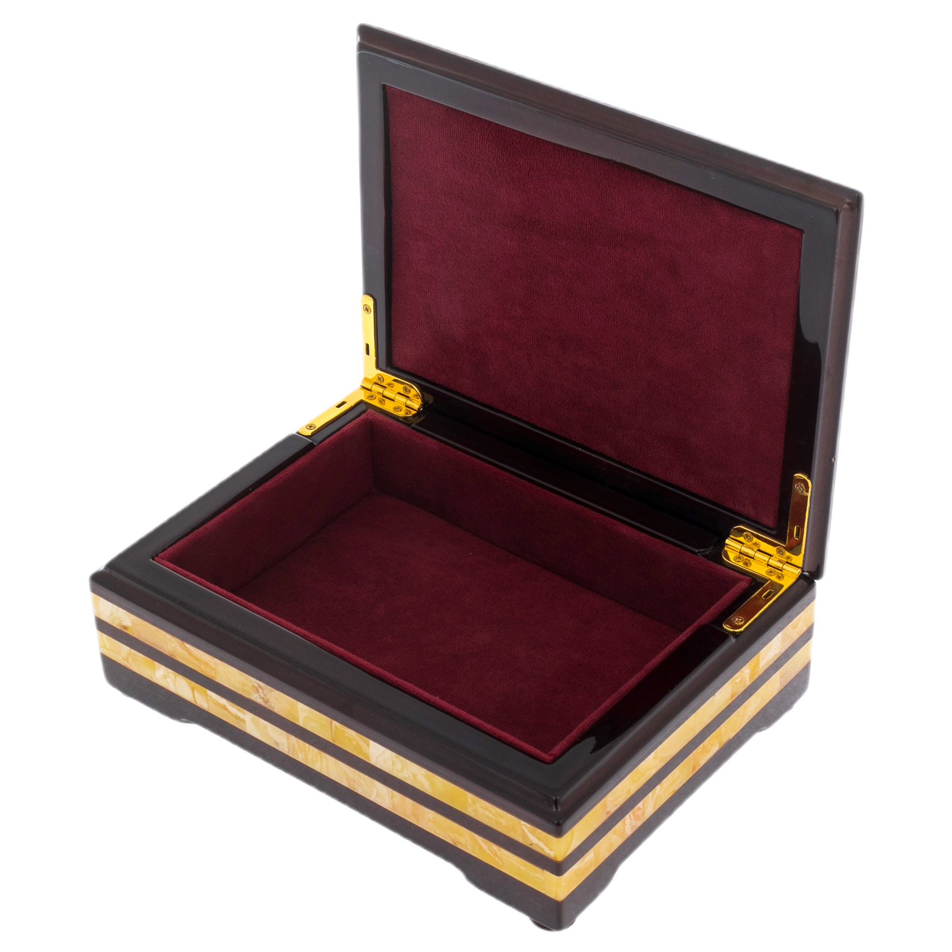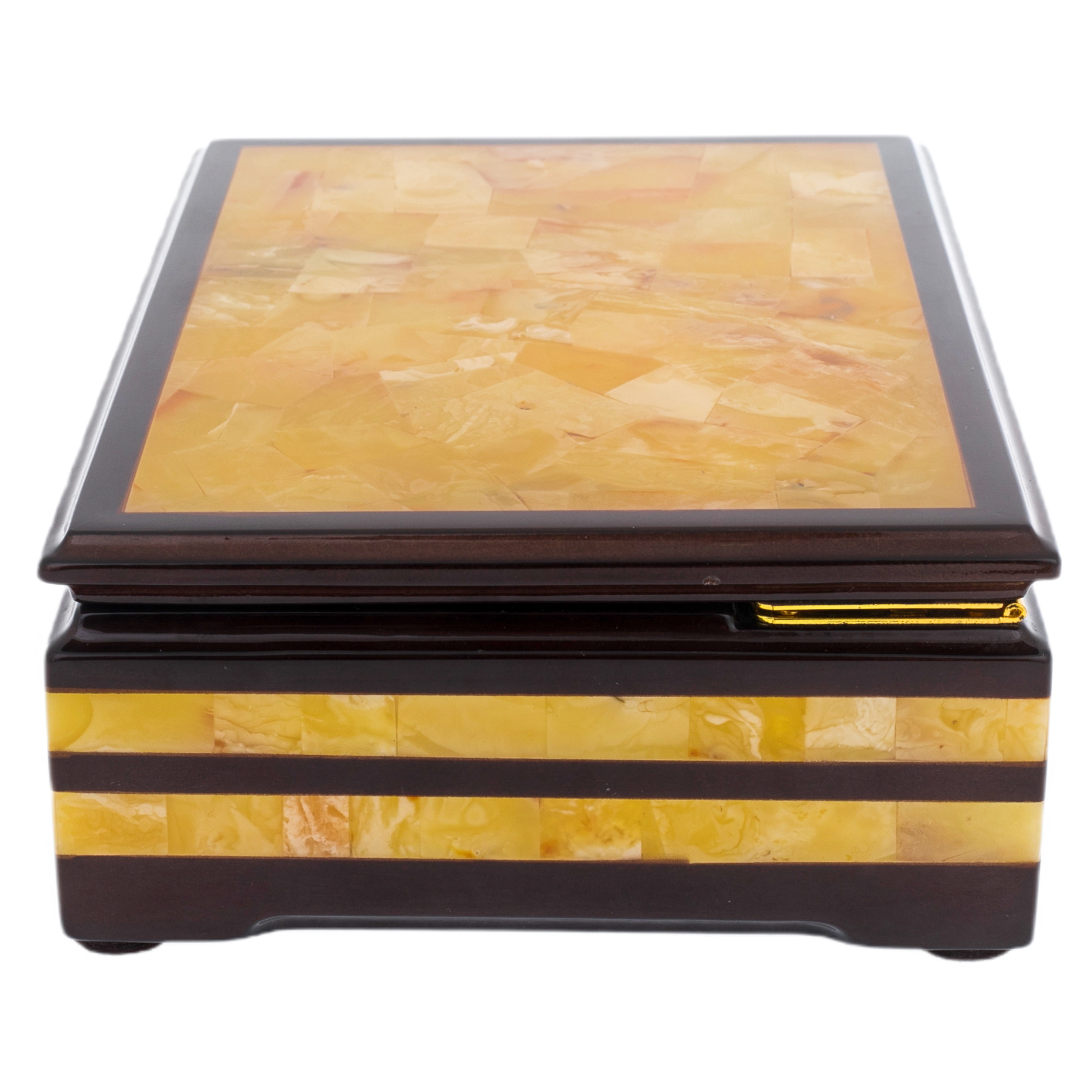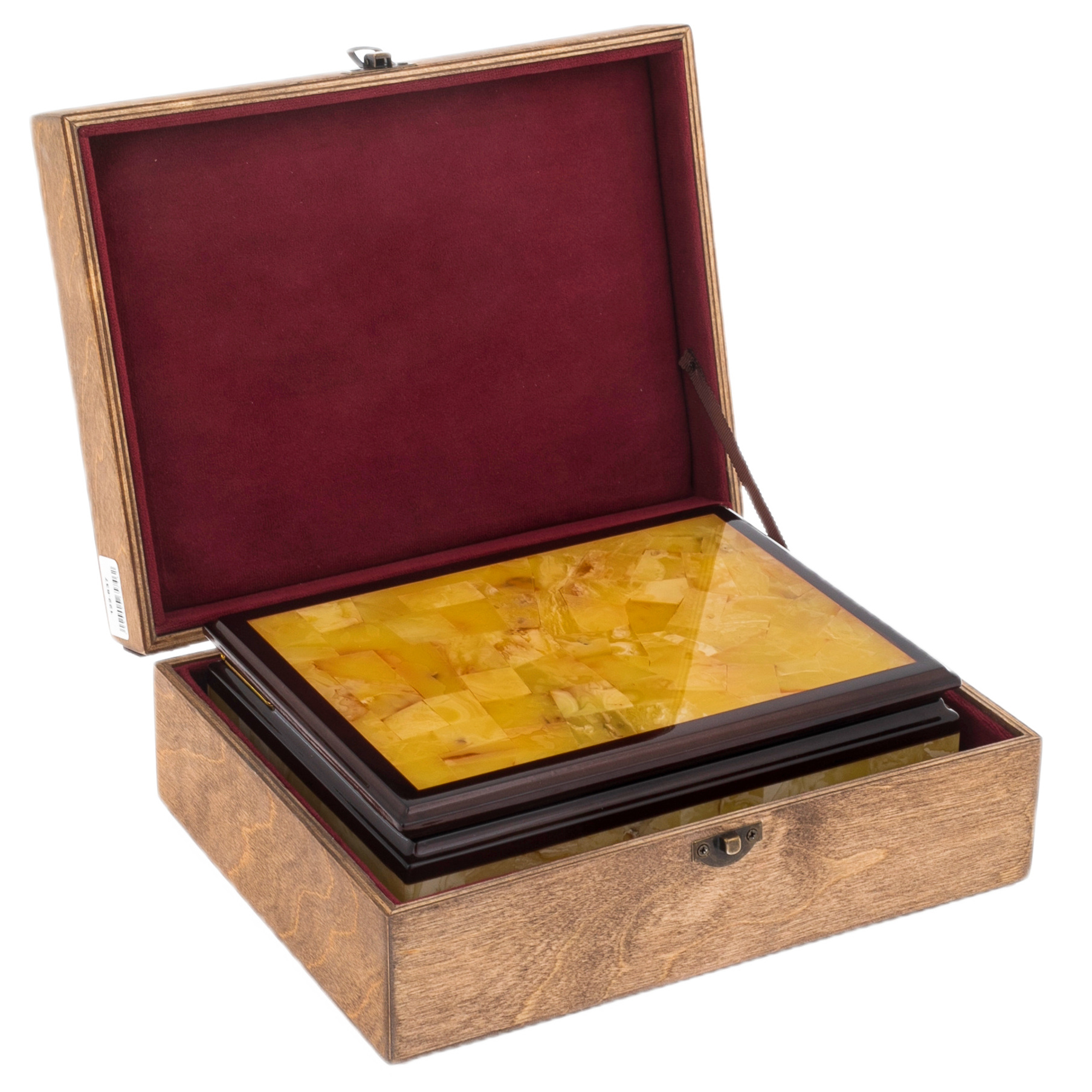 Шкатулка для украшений, украшенная натуральным янтарём, — произведение, предназначенное для тех, кто ценит редкость, спокойную роскошь и абсолютную продуманность каждой детали. Тёплый глянец коричневого дерева и янтарная мозаика, выложенная на крышке и боковых панелях, создают живописную композицию, насыщенную солнечными оттенками и естественной текстурой камня. Внутреннее пространство, обтянутое бордовой замшей, продуманно выстелено мягкой подложкой, предохраняющей драгоценности от прикосновения к твёрдой поверхности. Золотистые петли добавляют штрих завершённости — как изысканный аккорд в сложном музыкальном произведении.